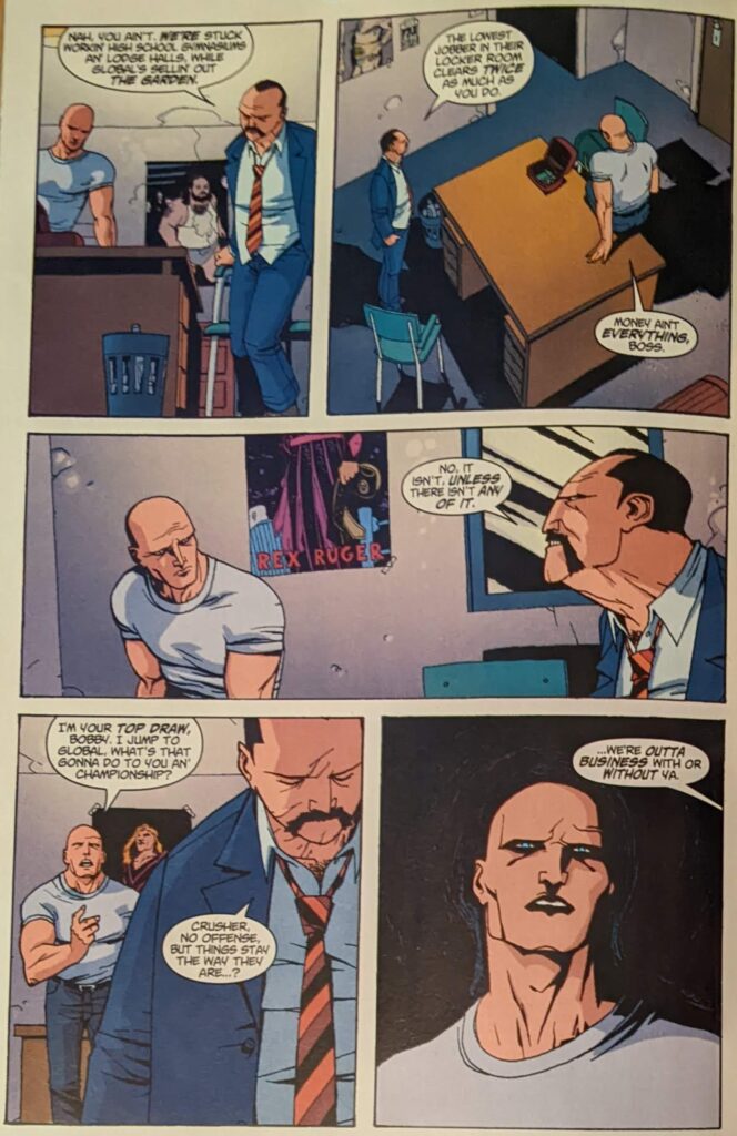 Not exactly the lovable doof of ASM 271. Crusher’s internal monologue goes on about respecting the sport and whatnot, and then he goes to see the bossman, who says there weren’t enough fans in attendance, and he can’t make payroll. He tells Crusher he should take the deal he was offered from one of the larger companies, but Crusher again refuses, loyal to a fault, it would seem.