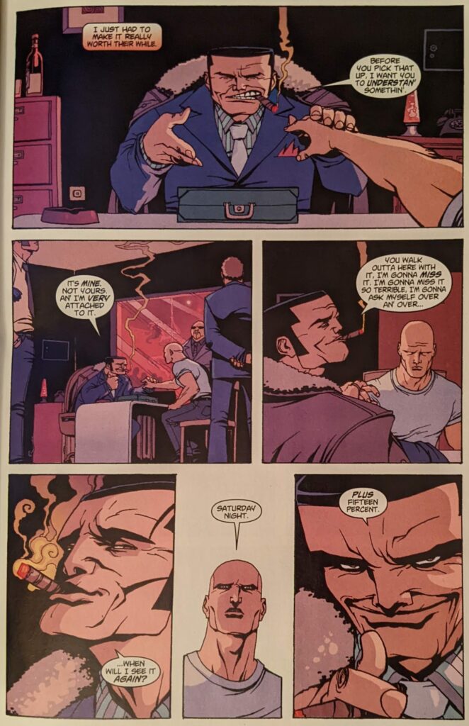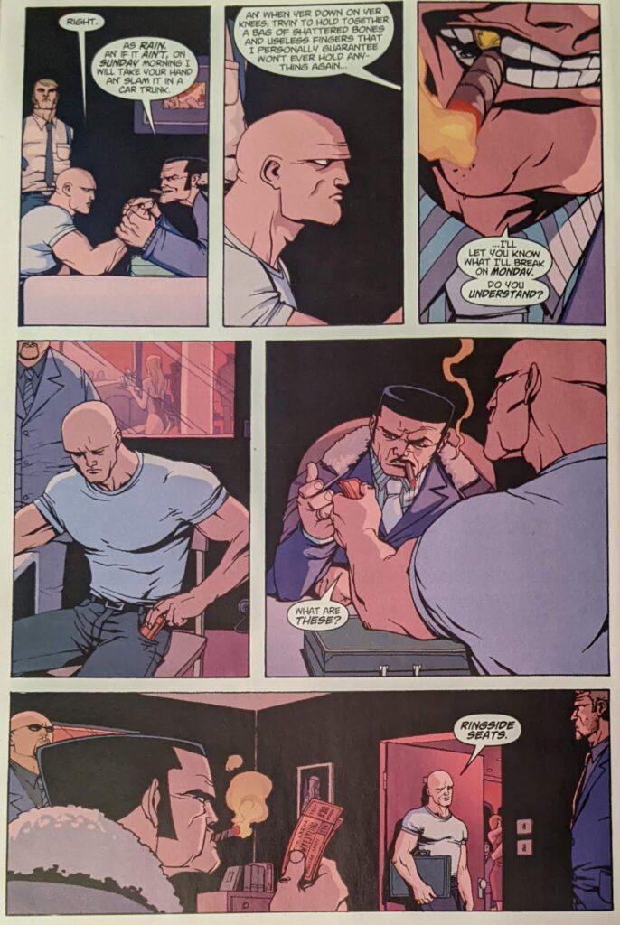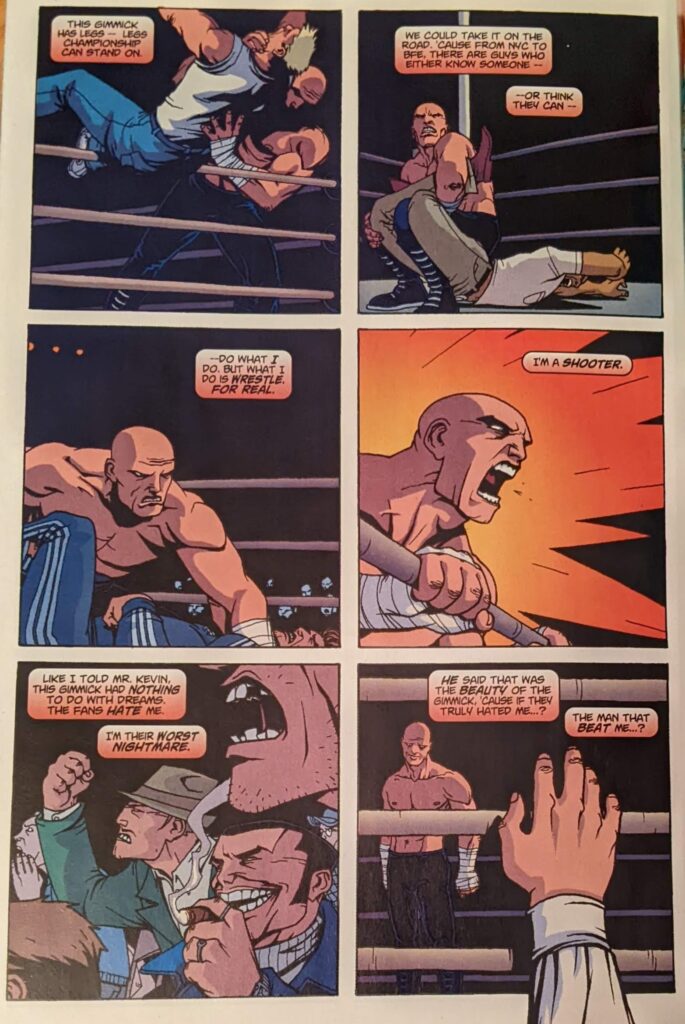 This issue’s cover is by Dave Johnson. Inside, we find a story by Brian Azzarello, Eduardo Risso’s 100 Bullets collaborator, and Scott Levy, who I don’t actually know. The illustrator is Giuseppe Camuncoli, who I had forgotten was working in the business this early, but who will be doing quite a bit of Spider-Man eventually. Buccelatto hangs in there on colors. We’re here for a sort of Crusher Hogan: Year One.