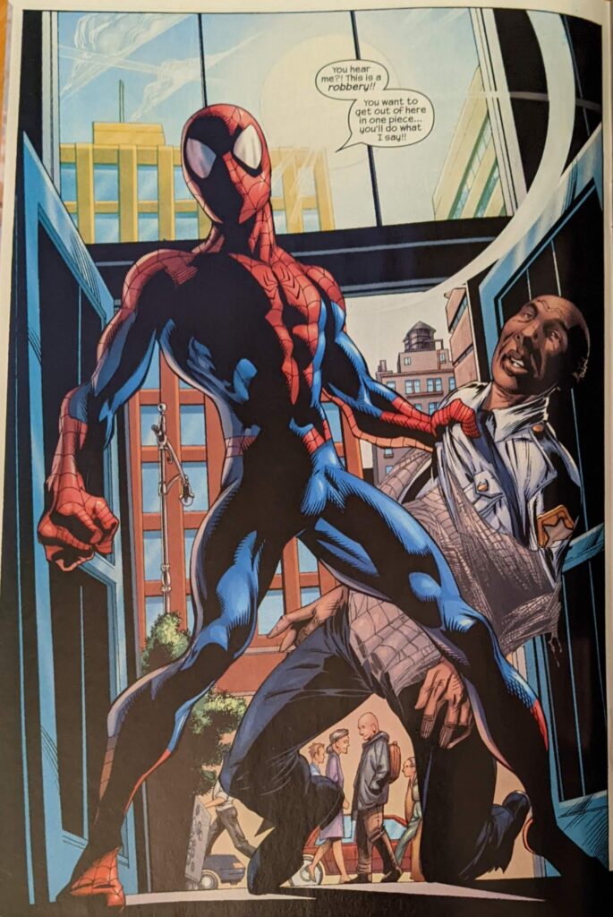 Well, Spider-Man’s sure changed his mind about crime since last we saw him! You know, I don’t remember noticing that the spider on this guy’s suit is wrong before.