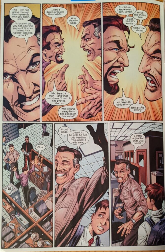 And the one on the back is the classic version instead of the USM one. Nice touches! Also nice is that this guy clearly doesn’t have any of Spider-Man’s body language. No leaping and crouching and stuff. It’s all very well considered. Our guy Ben is taking note as the Faux Spider-Man beats the bank manager and throws him through the glass of the teller window, then shoots some kind of web that looks wrong and swings in, audibly straining, while the hem of his shirt flaps up. Ben already smells a rat. JJJ, however, is typically elated when Ben arrives at the Bugle and tells him what’s going on. Peter Parker arrives at the end of the discussion, Betty Brant letting him know “that Spider-Man guy” robbed a bank.