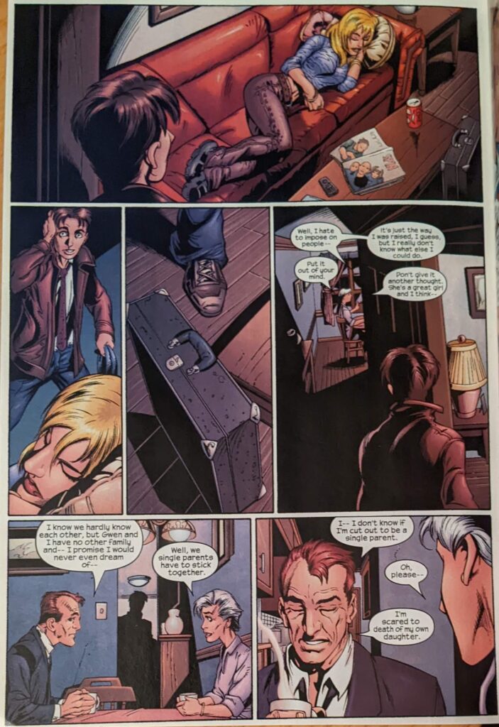 We’re back! Bendis! Bagley! Thibert. Transparency Digital! Art Thibert has apparently gone on to become one of these awful conservative idiots who rails against superhero comics starring heroes who aren’t white guys and/or against women having costumes that aren’t swimsuits. A real grown-up. I really hate his name being on so many of these. But someday, and I think it’s coming next USM block, he is replaced, and then I don’t have to make a face every time I look at the credits. So. When we left off, Spider-Man had just defeated the Green Goblin for a 2nd time, Peter Parker had just gotten ungrounded, and Gwen Stacy seemed really emotionally unstable. I think that’s all we need to get started.