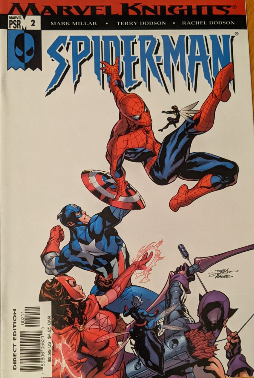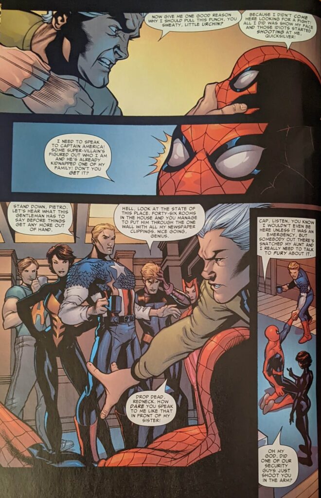 Here’s where I just gave up on this title. Spider-Man, card carrying reserve Avenger, can’t get into the Mansion because (checks notes) Jarvis refuses to look out a window. Like this is such a terrible excuse to have him fight the Avengers, like you know he’s about to. And if pressed, I’m sure Millar would reference 60s comics, where superheroes did stupid things like this all the time, as if those stories weren’t written for children, and these for an adult readership that is only getting older. And now the Avengers have a security detail? Earth’s Mightiest Heroes need rent-a-cops all of a sudden?? Crap, crap, crap. And I would be remiss if I didn’t point out the presence of Ann Liebowitz up there, actual, real world famous photographer. Millar loved putting real celebrities in his comics. He has Ultimate Nick Fury based on Samuel L. Jackson without his permission or consent. Jackson is a comics fan, and found out he was in the book when it was shown to him at his local store. If he hadn’t thought it was cool, he could quite literally have sued Marvel right back into bankruptcy. Like, the entire future of the company literally hung on him being a fan and being flattered. It’s reckless and stupid. Elsewhere, Millar had the lead of his series Wanted drawn to look like Eminem, while heavily implying that Eminem was in talks to play him in a movie. None of that was true, but it helped get the book some press. Millar is a shameless huckster, more carnival barker than comic book writer, and I find his antic exhausting. Spider-Man is smashing his way through all these SHIELD goons, allegedly moving so fast no one can get an ID on him (Literally impossible), having taken out Hawkeye in one panel and Scarlet Witch off-panel despite her being probably the most powerful single member of the team. Quicksilver and Captain America are now also on the case of “The Mysterious Intruder Who Announced Himself as Reserve Avenger Spider-Man When He Arrived.” Hope they brought their detective hats!