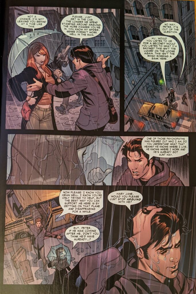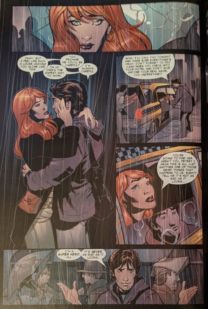 This one I remember in detail. It sucks. Man, reading this series is like a death march. I got used to mostly enjoying these comics, more fool I. Well, it begins with Peter trying to put MJ in a cab in the rain.