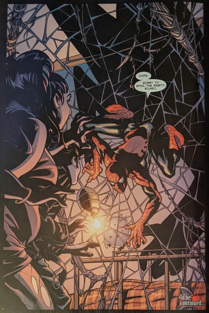 Just stupid, stupid, stupid. So stupid. Not a word of this plays! I am so unhappy to be reading this again. Spider-Man has now broken into The Owl’s lair, and gives HIM more info about May than he gave THE AVENGERS, and convinces him to look into her kidnapping by saying he’ll owe Owl a favor. Then there’s this weird page were the guard Spider-Man knocked out talks about how he had surgery for Crohn’s Disease, a condition Millar actually suffers from. I don’t know why that got a page. Then Owl returns saying the names of Electro and Vulture.