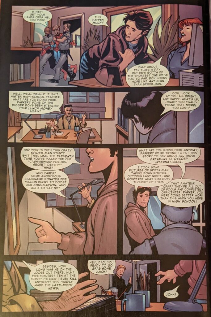 MJ’s gun debuted a couple issues ago, I just didn’t care enough to comment. Shout out to Terry for drawing their wedding bands. Very rare. Soon, JJJ is having a doofus trying to claim he’s Spider-Man for the money thrown out of his office.