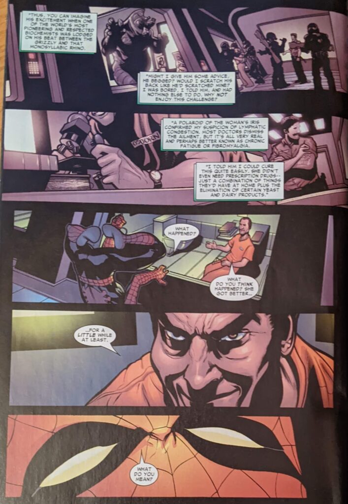 Spoilers: She is not. Well, now it’s off to the big criminal get together. Everyone’s there, it’s the Met gala for bad guys. Easily the most shocking twist of all in this series is Millar has Hydro-Man bring as his date Sadie, the girl from the first Hydro-Man story way back in ASM 212, the one him and Sandman fought over in ASM 217. That is an immensely deep pull. Well, anyway, time to learn why we’re here.