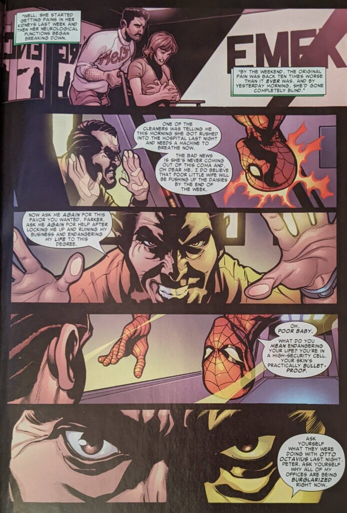 Yeah, yeah, he’s evil and such. And there’s a conspiracy brewing, and the revelation of what it is is going to be prrrrretty stupid and never spoken of again. Next, Spider-Man is swinging to the X-Mansion, like it’s just in the city, thinking to himself that MJ told him Liz Osborn is trying to get her to go to their high school reunion despite the fact that we all know MJ didn’t go to school with them. Whatever. A young telepath leads Spidey into the school, only for him to be told Emma Frost had to run off for an emergency. I just remembered Jean Grey is currently dead again. It’s what she does, Grant Morrison having killed her off at the end of his run of X-Men. And she stayed dead a good long while this time, like maybe 12 years or something.