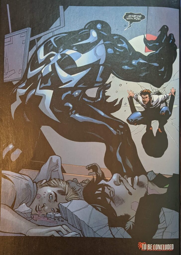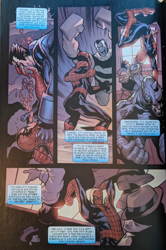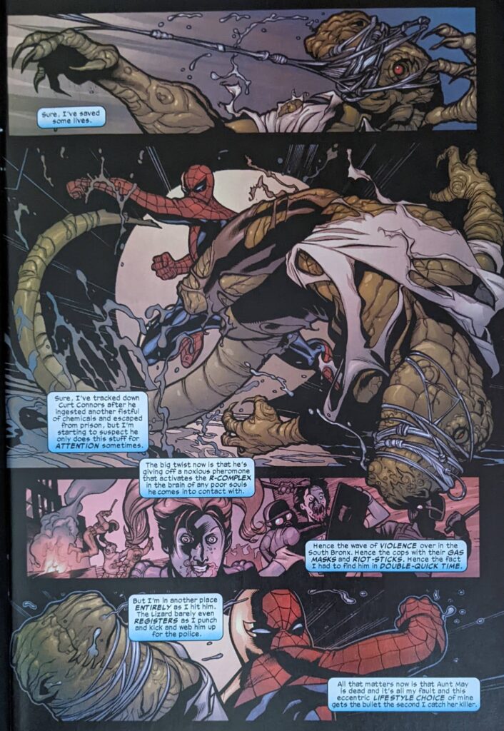 Well. We’re past the halfway mark. Let’s get this over with. You know, this one’s been sitting on my desk all day, and I kept seeing Rhino’s lovingly sculpted hindquarters from a distance, and it read like a shoulder to me, but extending down into a weird mass that couldn’t be a human arm, if you want to know where my head is today. This one opens rather jarringly with Spider-Man fighting the Lizard in a sewer. Like, we thought he was gonna rush to the auction because it had something to do with May, and we left off there, the big reveal of Venom, and now we’re… not following up on either of those things. Lizard has apparently killed a whole bunch of people, torn them open. Not really on-brand for the Lizard, but very on-brand for Mark Millar. Spider-Man says this is how he’s been spending his nights since he was 18 (Bzzzzt), but he’s giving it all up soon. Oh, good, one of the all-time worst Spider-Tropes is getting thrown in here, too, why not?
