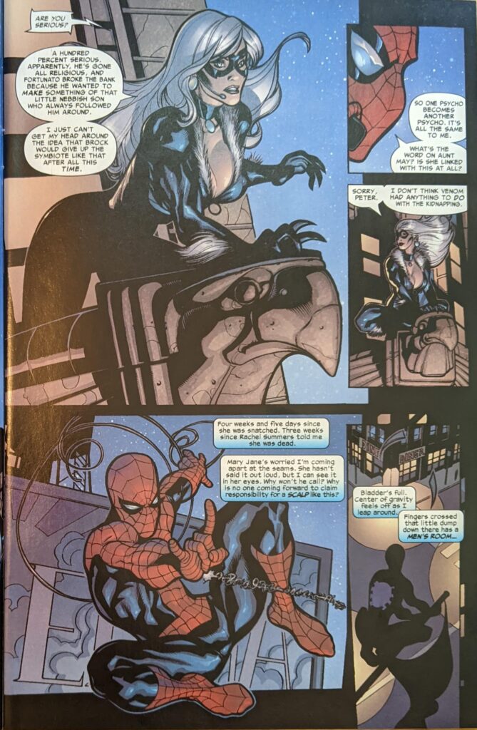 So… we’re just ignoring the cliffhanger last month entirely? Now it’s been at least 4 days since the end of last issue? Ok, fine, I don’t care. Based on the year and the haircut, I’m assuming Rhino kidnapped Alizee? I primarily know her as the source of a dance in WoW, I’m not an expert, but it seems to fit. Maybe Millar just didn’t like her. Weird that he has the guts to name check all these extremely famous people in his comics, but not her. In The Ultimates, Hulk can be trying to kill Freddie Prinze, Jr. in one of the most cringe-inducing sequences of the decade, but mum’s the word on who this “French singer/songwriter” is. Am I stalling so I don’t have to keep reading this comic? Maybe. The next page shows Spider-Man fighting “a perfect replica” of the Spider-Mobile before telling us TWO MORE WEEKS passed since the end of last issue. TWO WEEKS! If Aunt May being missing wasn’t a central component of this comic, I could break up this story with issues from other series. Two weeks! Then, now, in the present, Felicia finally tells Spider-Man she found out Don Fortunato won the symbiote in that auction.