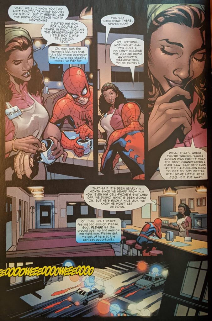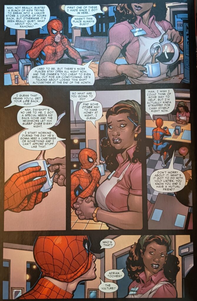 5 weeks since issue 1, 3 weeks since last issue. Being real luxurious with this timeline considering Spider-Man appears in 2 other monthly titles, but increasingly, no one cares about that. Well, next page, Spider-Man sneaks into “Nighthawks At The Diner” (????) and gets in trouble for using the bathroom without buying anything and is forced to sit down and order a coffee.