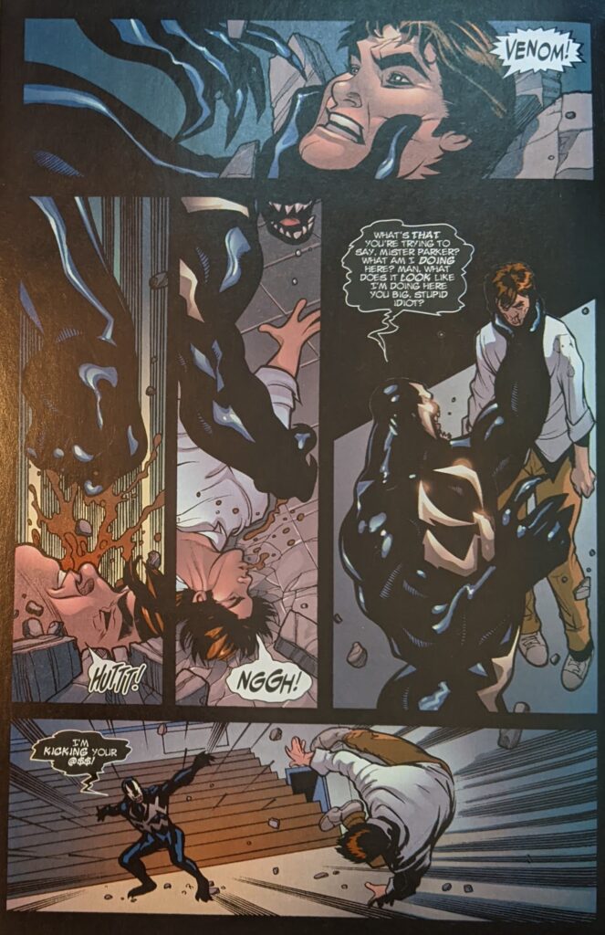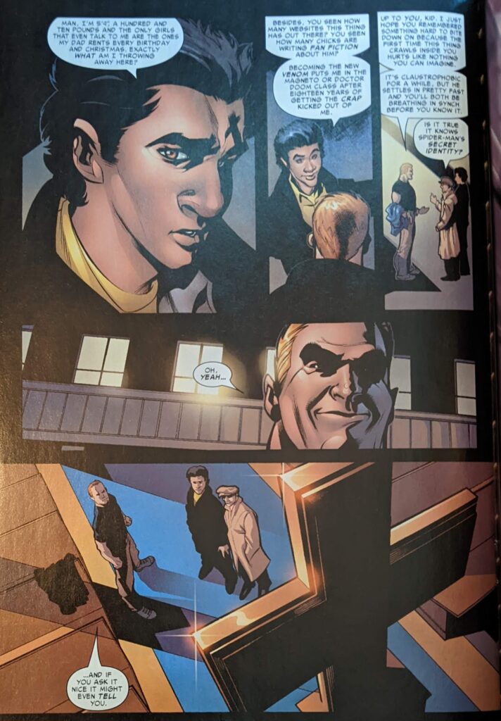 Solid bit, I must say. Then the boys all want Peter to go take a picture with them in the gym. They are being childish and cruel, everyone suddenly decides to info dump at each other about why Flash isn’t there, and then they try to give Peter a wedgie for old times’ sake. Really. A small army of grown men. Peter says the first person to touch him is leaving on a stretcher, really rising to the occasion, all as a Venom-shaped figure is intercut swinging through the night.