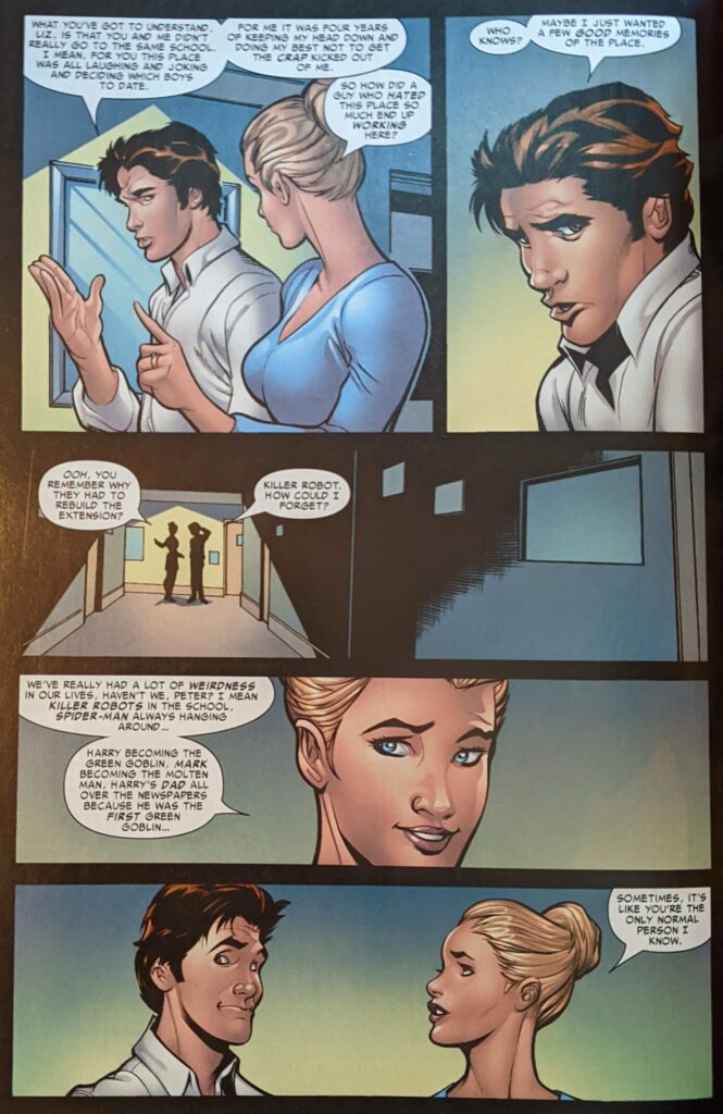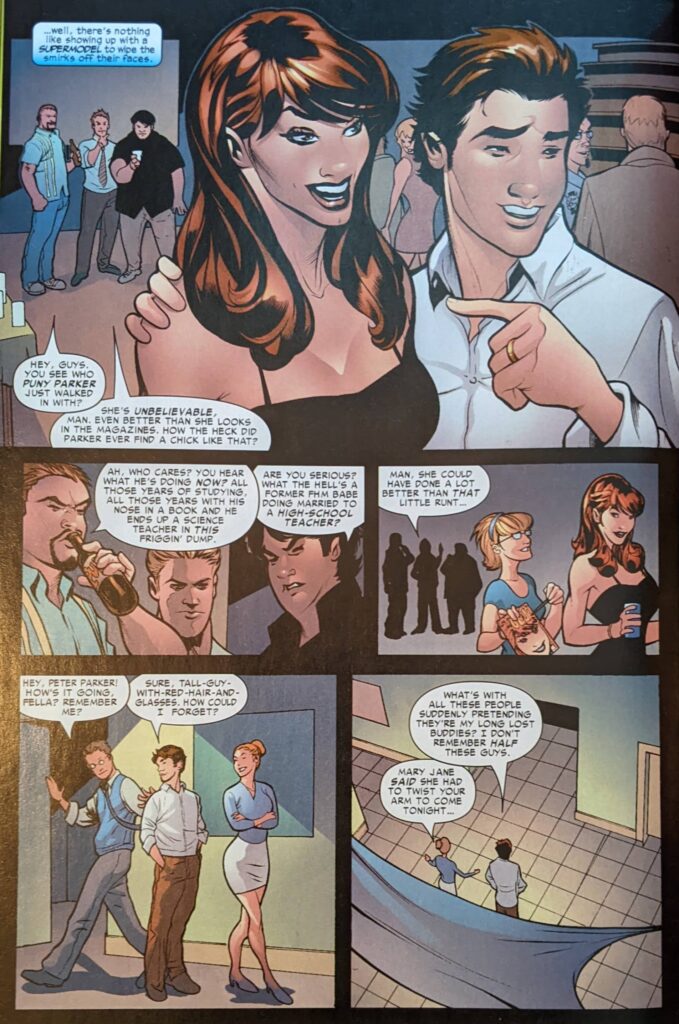 Whatever. Now we’re at the reunion, where the narration suggests MJ did NOT go to high school with Peter & Liz despite the way last issue read. Fine! Peter talks to his old teacher, Mr. Warren (Not to be confused with his brother, Miles).