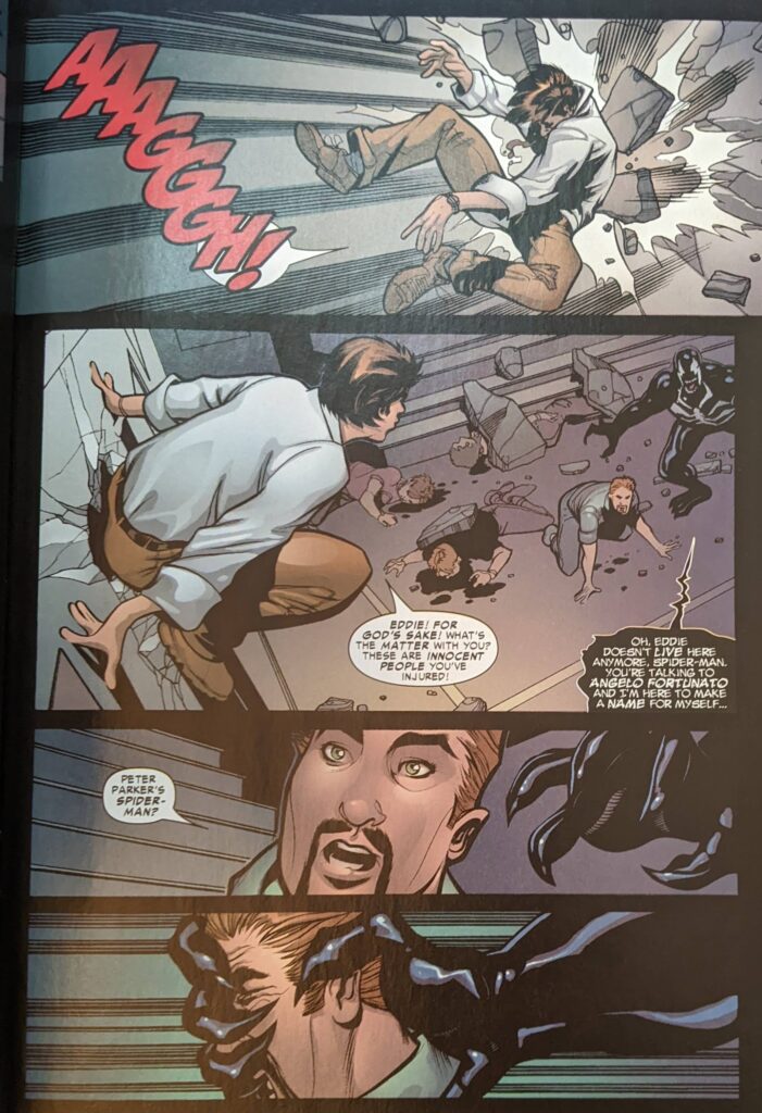 They say there’s a million stories in the naked city, but apparently only one in this series. What an appallingly lazy coincidence. The cops turn out to be responding someone hanging off the Chrysler Building pretending to be Spider-Man for the money. Peter is now home, running through his list of people who know his secret again, belatedly wondering who gave the Bugle $5 million for this contest. MJ tells him he has to relax, just for one night, and that they should go to the high school reunion. Meanwhile, Fortunato is about to take delivery of the symbiote. He endlessly belittles the son he intends to give it to while Eddie asks the kid if he really wants to do this.