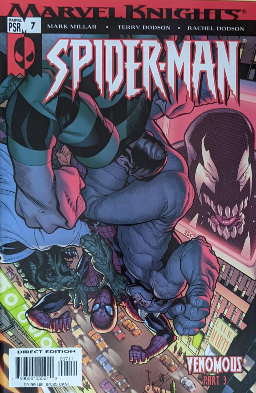 Well. We’re past the halfway mark. Let’s get this over with. You know, this one’s been sitting on my desk all day, and I kept seeing Rhino’s lovingly sculpted hindquarters from a distance, and it read like a shoulder to me, but extending down into a weird mass that couldn’t be a human arm, if you want to know where my head is today. This one opens rather jarringly with Spider-Man fighting the Lizard in a sewer. Like, we thought he was gonna rush to the auction because it had something to do with May, and we left off there, the big reveal of Venom, and now we’re… not following up on either of those things. Lizard has apparently killed a whole bunch of people, torn them open. Not really on-brand for the Lizard, but very on-brand for Mark Millar. Spider-Man says this is how he’s been spending his nights since he was 18 (Bzzzzt), but he’s giving it all up soon. Oh, good, one of the all-time worst Spider-Tropes is getting thrown in here, too, why not?