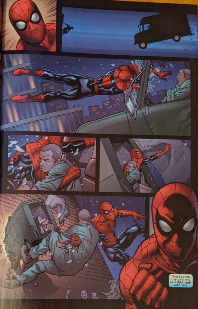 Credit where it’s due, that’s a good page. Millar keeps having Spider-Man reiterate that the symbiote feeds on hate, even tho, you know it doesn’t. He also postulated awhile back that Angelo must be full of hate to make “Venom” so huge, which, again, is nothing. “Venom” runs and Spider-Man chases him. “Venom” pulls the old invisibility trick I think everyone forgot he has…