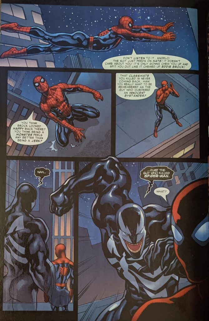Cheap shock. It’s all Millar has. The big punch on that last page is clearly modeled on the one from ASM 121. People sure love to reference that image. It’s a great panel, no doubt. So, Spider-Man just decides to start winning this fight, and then is. He pummels “Venom” and there’s nothing he can do about it. The symbiote FINALLY gets a say, but what it says is stupid, saying Angelo’s fear “is shaking them apart.”