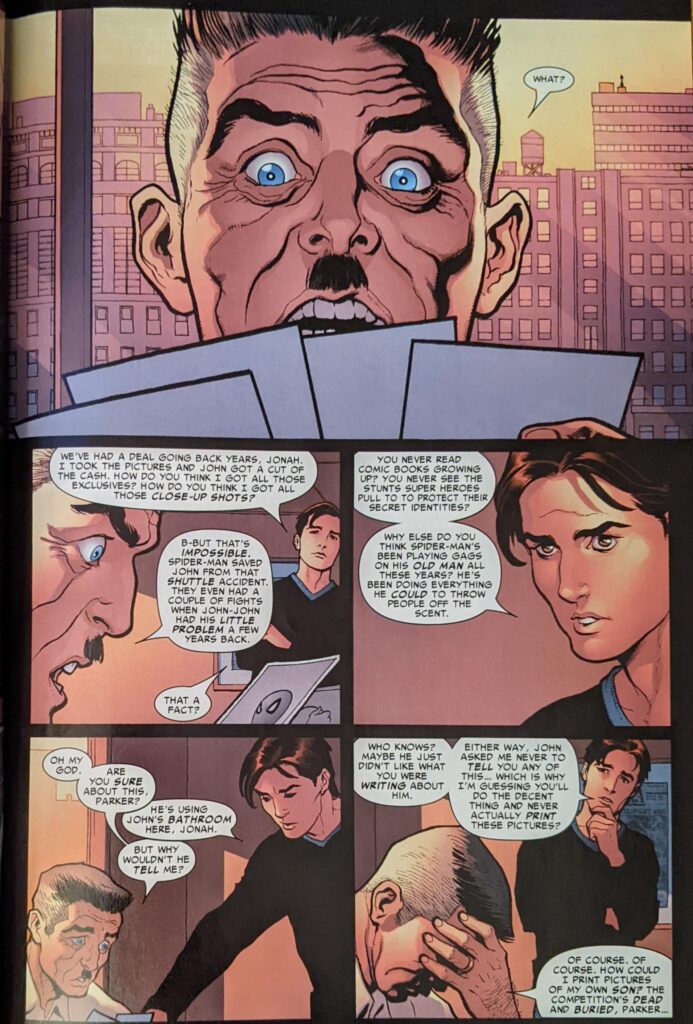 The fruit drop is a good gag. So ends the brief, yet still too long career of the 2nd Venom. Not only did Angelo die, we’re told Eddie Brock slit his wrists and “probably won’t make it” (He will). But what Spider-Man is focused on, reasonably, is the poor sap who got murked in that cheap fake out earlier. He thinks this stupid bounty has gone on too long (Correct!) and it’s time he put a stop to it. So we cut to an establishing shot of the Bugle, wherein JJJ is asking Peter if he really found out who Spider-Man is.