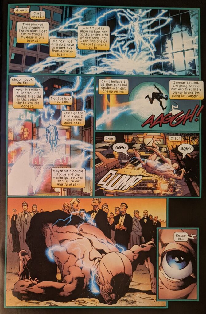 The idea that Ultimate Electro doesn’t have ears is really, really, really weird looking. In Bags’ more stylized approach, I didn’t even notice, but here, it looks WEIRD. Why doesn’t he have ears??? What part of being an electric man means no ears? How does he hear??