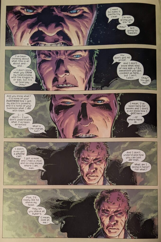 Well, we’ve just come from seeing BEndis not handle a crossover event too well in Secret War, and now we hop back in time awhile to see him take a stab another one. This one starts like 6 months before Secret War 1. An official team-up between Spider-Man and the Ultimates! Sort of. This one didn’t go over too well, but who knows, maybe reading it in 6 days instead of 6 months will make it sing. Can’t be worse than Ultimate War, a comic that promised me a Ultimates/X-Men team-up, which I bought because I read one of those books, and then, like every single story with the X-Men in it, it turned out to be an X-Men story sort of guest starring the team I paid to see. John Cassaday on covers here. He’s a big start by now. He really got noticed on Planetary with Warren Ellis at Wildstorm, and in this moment, I think, has just come off a year+ on the very misguided Captain America relaunch where he fought terrorism to draw Joss Whedon’s Astonishing X-Men. Whedon’s star being where it was in nerd circles at the time, that’s a major move. A very in-demand artist. Inside, tho, we have Trevor Hairsine. A guy who did a lot of stuff in this period, but neve really took off. Very much in the “realism” mode sweeping Marvel in the 2000s. But first, a prologue drawn by his and everyone else’s boss, Joe Quesada. Joe didn’t have much time to draw anymore once he became Editor-In-Chief, obviously, so that, too, was a big deal. Both of them are inked by Danny Miki, who seemed to be Joe’s inker of choice for most of the 21st Century. Quesada/Miki are colored by Richard Isanove, while Hairsine/Miki are colored by Dave Stewart. That should make for a jarring contrast. Let’s take a look! We open on Electro waking up in a hospital.