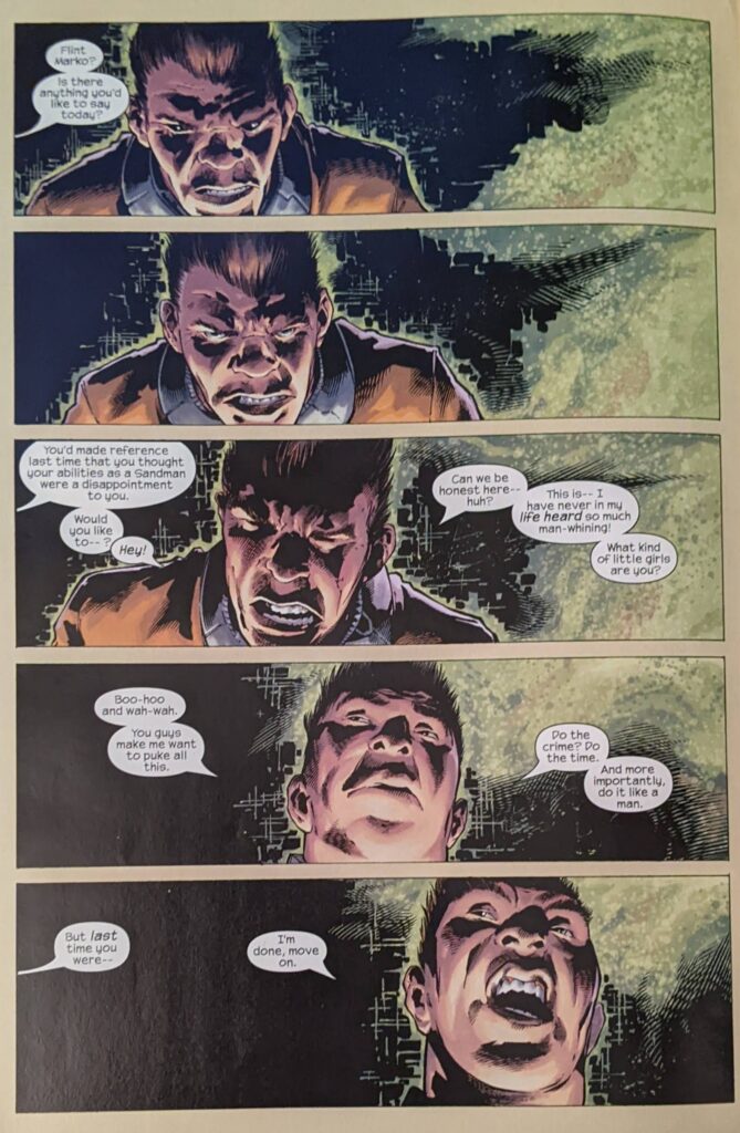 Well, hey, that’s 4 Spider-Villains all lined up. It turns out their group therapy sessions are overseen by Hank Pym, aka Giant-Man in the Ultimates (I can’t remember if this Hank was meant to have ever been an Ant-Man previously). Boy, the treatment of his & Jan’s relationship in that book… Ugh. Norman notes that they’re wearing an advanced model of the “Richards gene nullifier” (Bzzzt!) once used to stop the Hulk, and he wants to know why he and Otto are wearing one if they don’t have access to their arms and drugs. He reasons this means Hank knows something about their weird genetics that they don’t, and want to know what they know. Then Fury shows up. There’s a fun bit where Norman acts like he’s Fury’s archenemy and Fury barely acknowledges him. Fury reveals that, by turning themselves into “illegal, unnatural, genetic mutations,” they gave up their rights, and now all they can do is either work off their time as a sort of Suicide Squad situation, or sit at rot, and he doesn’t care which they choose. He makes sure they know that Dr. Pym is the only person in the facility who doesn’t want to kill them and takes off. But, hey, we’re like halfway through this issue and haven’t seen Spider-Man or Peter Parker, so…