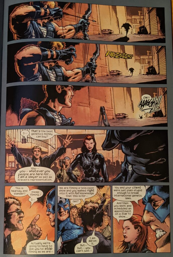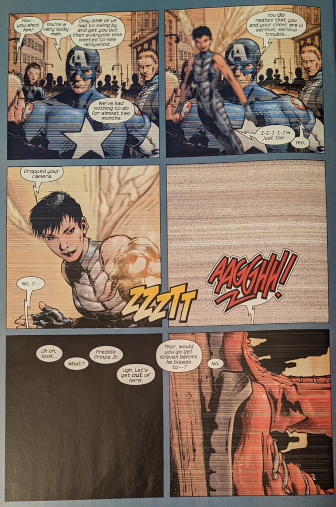 The Freddie Prinze, Jr. joke. Millar had Hulk rampaging through New York trying to kill Freddie Prinze, Jr. It was savagely made fun of at the time despite being a major set piece in one of Marvel’s biggest hit comics, and it aged like milk. Well, soon enough, Sharon Carter and the gang have detained Kraven, and in his rage, he reveals he can kind of turn into a wolf man or something now. But they just electrocute the crap out of him and he’s no threat to them. Kraven should be this much of a jobber always, in all media. He certainly shouldn’t be the star of his own movie!
