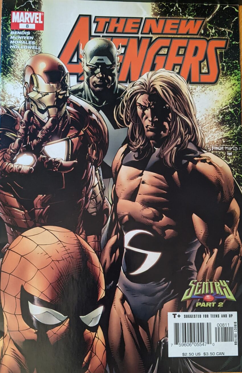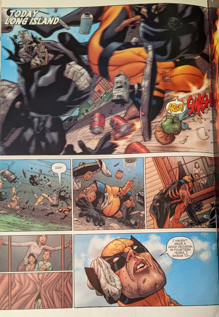 It’s worth mentioning that, after we stopped looking at Ultimate X-Men, the rest of the Bendis/Finch year was called “The New Mutants,” and featured several shorts introducing, well, new mutants. One was a standalone where Wolverine went to visit a kid hiding in a cave. The kid’s mutant power had manifested, and was essentially nerve gas, killing everyone in his town. Wolverine could heal through it, and went to talk to the kid bring him some beer, and then kill him, because there was no saving him from his own power. It was a pretty remarkable comic. And this whole thing with the Sentry hiding in a cave, by the same writer & artist, even, looks a whole lot like it. From there, we flashback to a week ago (Not yesterday?) and an extended sequence when Tony was trying to convince Wolverine to join the Avengers on the helicarrier. He mentioned the Mark Millar/John Romita, Jr. Wolverine run, where Logan was made a brainwashed Hydra assassin, and pointed out that being an Avenger could help repair his name, and that standing next to Captain America inspires you to do better. Logan wasn’t fully convinced, but eventually, said “yes,” obviously, since he’s now being smashed by the Wrecker.