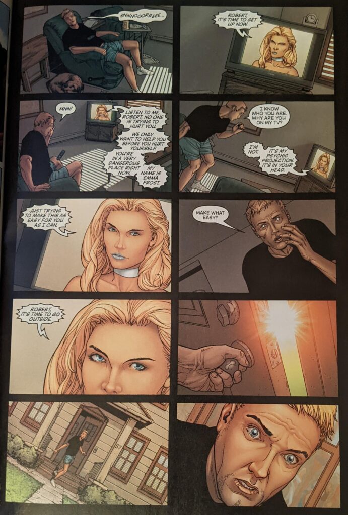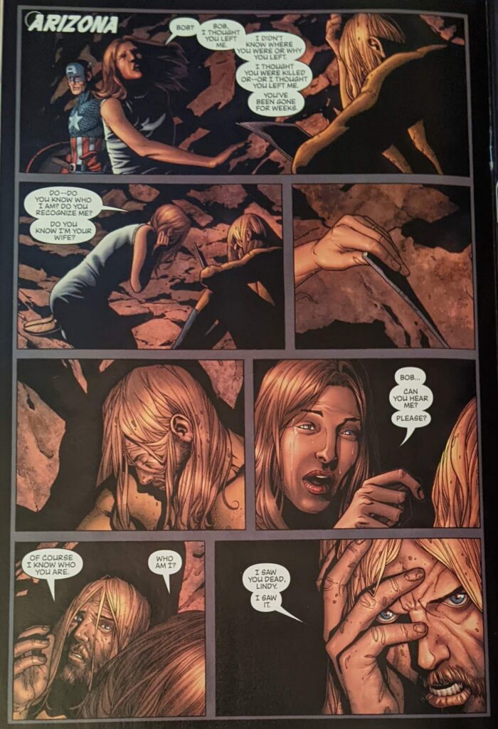Bob reiterates that the last time he saw Lindy, she was dead at “his” hands, and beings white hot and disappears. He appears in their home, shorthaired and clean shaven, in normal clothes, to start watching TV with his dog. Back on Long Island, Spider-Woman talks Wrecker down, asking if anyone’s ever asked him what he really wants, if he never dreamed of something bigger than this, referencing his defeat in the Runaways comic recently, and once his guard is down…