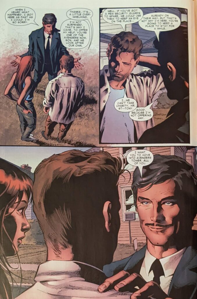 I wonder who’s playing Aunt May. I feel like I almost know in panel 2 there. Well, she’s over the loss of her family home, but I’m not. A pretty reductive choice, and as we know, reductive choices are rarely permanent. Well, that settled, we next find the Parker clan and Tony in an elevator up to their new home, where the rest of the Avengers are waiting. In uniform, even (Except for Luke, of course). Tony introduces them all to the Parker ladies one by one.