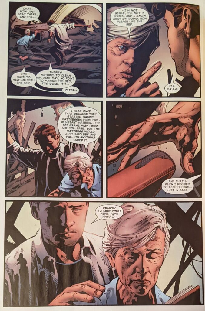 Hey, look, we’re randomly using a new logo. Why? To usher in the New Avengers era? As good a guess as any. New Avengers’ first arc is wrapping up the month this comes out. Spectacular is on #26, almost out of gas, but both ASM and MKSM catch up with Spidey’s new status quo at the same time this month. In my recollection, this arc isn’t as offensive as Sins Past or as offputting as Skin Deep. It just ends up being pretty stupid. But it starts where last issue left off, with Aunt May’s house in ruins. And in narration, Peter Parker blames himself, thinking he’d worried all these years that Spider-Man would ruin his loved ones’ lives, and in the end, it was Peter Parker who got both he & MJ’s apartment and Aunt May’s house burned.