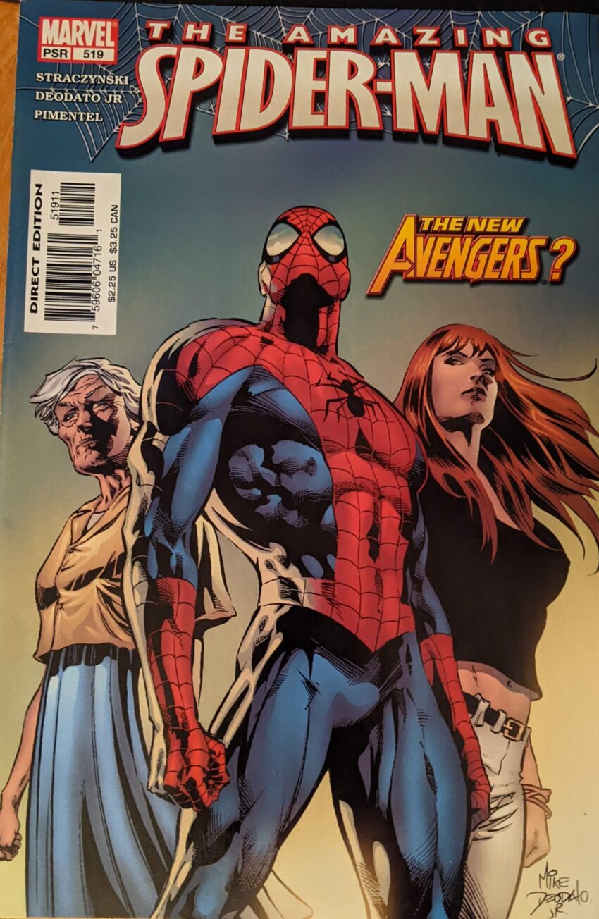 Hey, look, we’re randomly using a new logo. Why? To usher in the New Avengers era? As good a guess as any. New Avengers’ first arc is wrapping up the month this comes out. Spectacular is on #26, almost out of gas, but both ASM and MKSM catch up with Spidey’s new status quo at the same time this month. In my recollection, this arc isn’t as offensive as Sins Past or as offputting as Skin Deep. It just ends up being pretty stupid. But it starts where last issue left off, with Aunt May’s house in ruins. And in narration, Peter Parker blames himself, thinking he’d worried all these years that Spider-Man would ruin his loved ones’ lives, and in the end, it was Peter Parker who got both he & MJ’s apartment and Aunt May’s house burned.