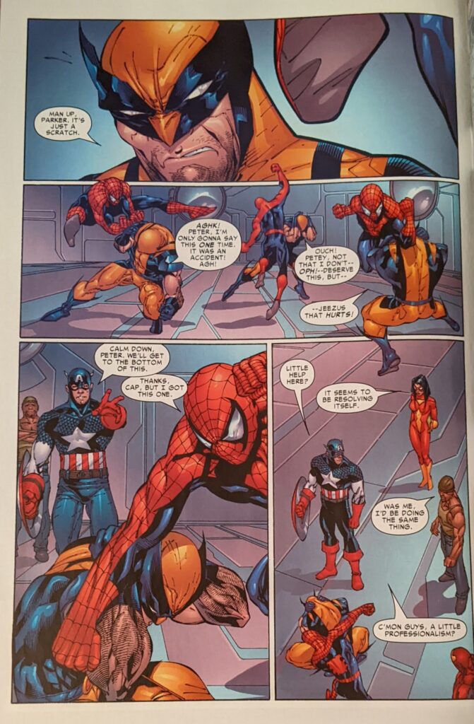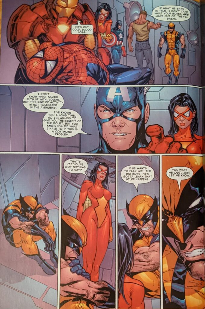 ..which now seems to have become a “cutting.” Tan can’t even be bothered to put the spider on Spider-Man’s back. Wildly out of character Captain America. Everyone just batting 1000. Iron Man breaks it up, Wolverine taunts Spider-Man about being a loser again, so he gets loose and attacks some more, then passes out.