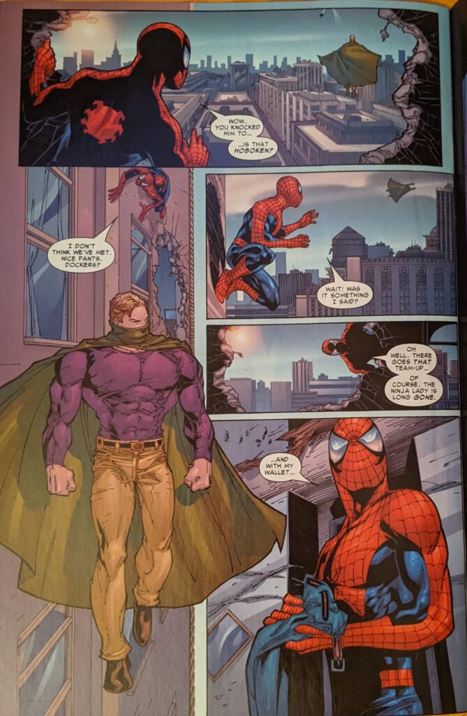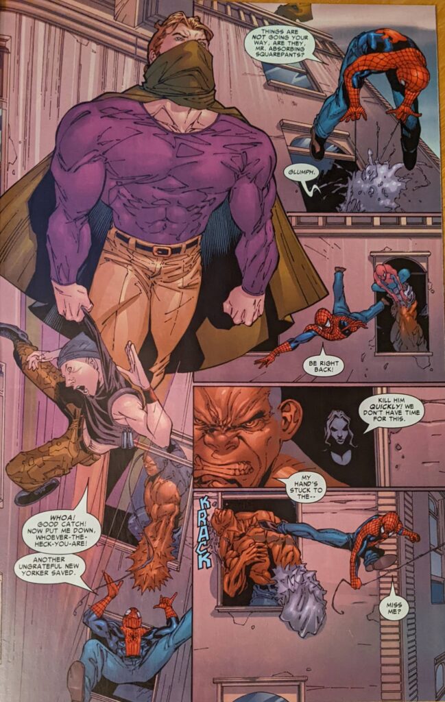 Between “Mr. Absorbing Squarepants” (I guess… absorbing like a sponge?) and Spider-Man leaping off that window only to come right back, you guessed it, this page sucks. Crusher’s handler throws water on him so he can get loose, but she didn’t warn him and he just falls out the window as a puddle. Then Spider-Man has gotten out of his jeans and comes back. She tried to pretend she was just an innocent bystander, but his Spider Sense tells her he’s lying, which it cannot do, and he tells her this, which he should not do. So she throws some ninja stars at him, and then Crusher comes back, having climbs up the outside of the building.