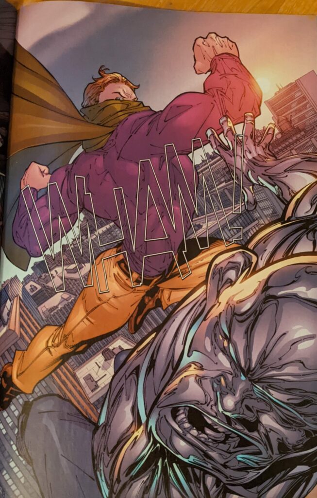 Well, that’s sure creepy. Soon, Crusher is killing another mob guy, who has a whole lot of protection due to what’s happened around town, and Peter & Ethan are walking down the street when one of the people Crusher is fighting goes out a window. Peter tries to give Ethan the slip, and Ethan picks up on that. But they split up, anyway, and Peter only gets into half his suit because he’s in a hurry to save the guy hanging off the window sill. But as he approaches, Crusher knocks the guy loose. And then…