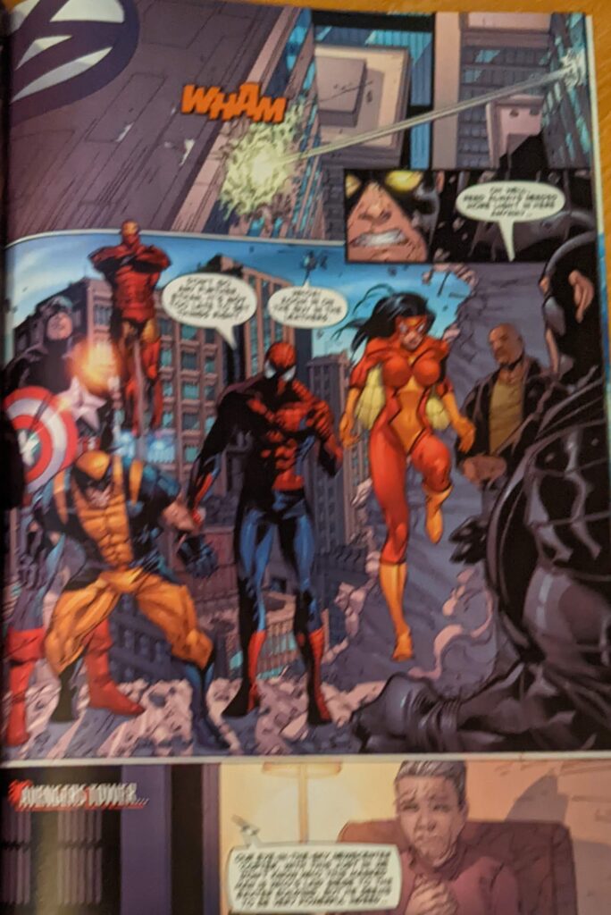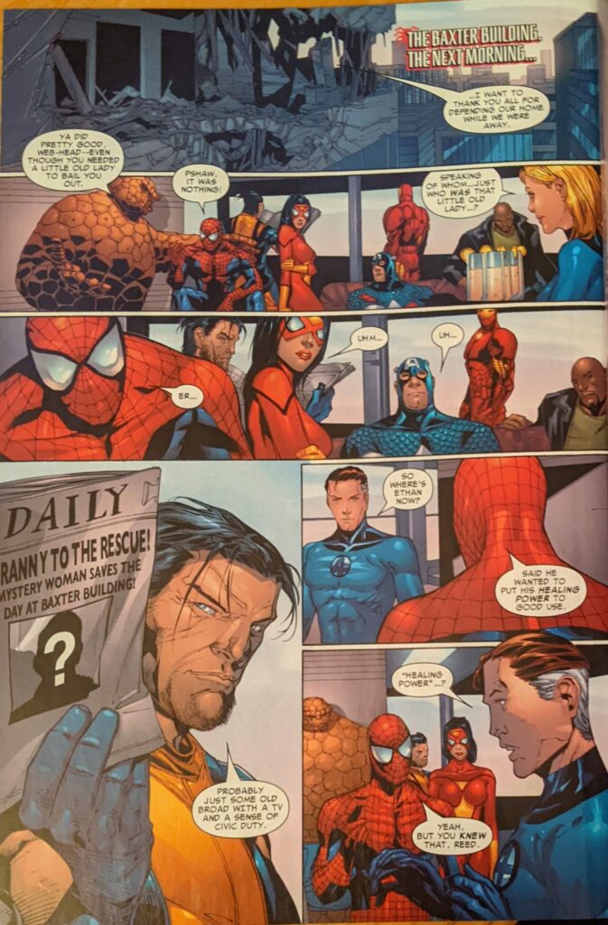 Were the Avengers inside, and they blasted Ethan into a nearby building? Did they smash INTO the Baxter Building from a nearby building? All of them, like, at once? I don’t know what’s happening. The news broadcast is seen by Aunt May and Jarvis, and Aunt May says she can see than is just a boy, like Peter, and they… leave to go to the fight. This is so stupid. Ethan’s whupping everyone, blah blah blah.