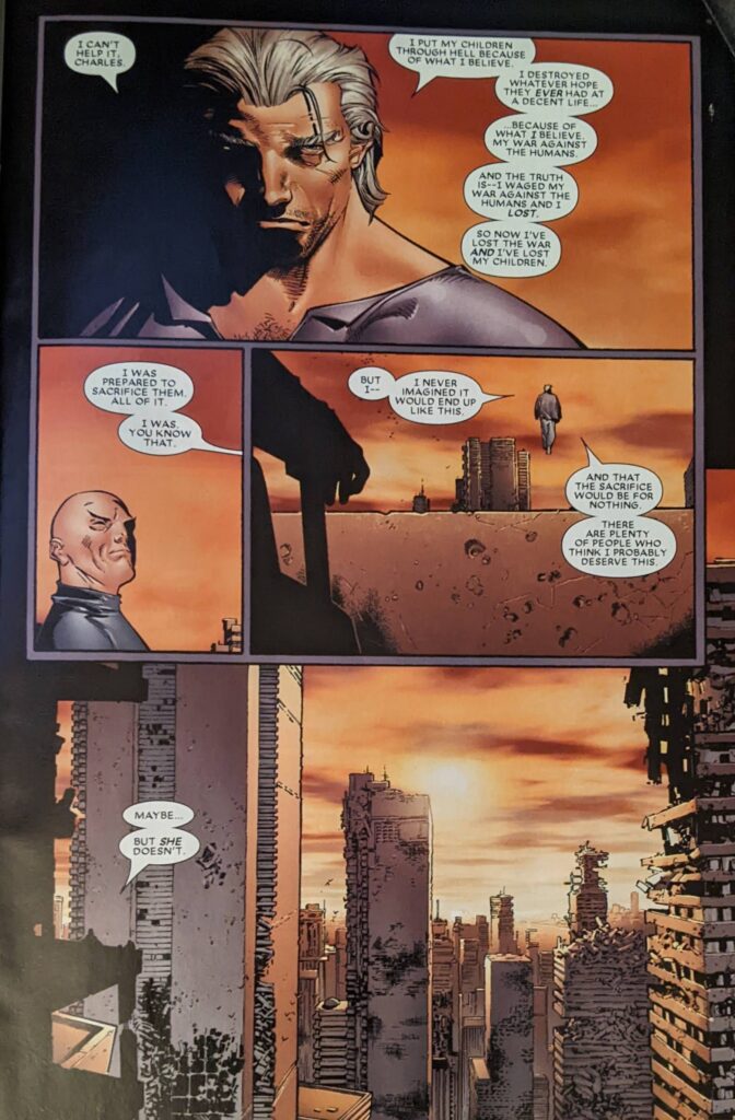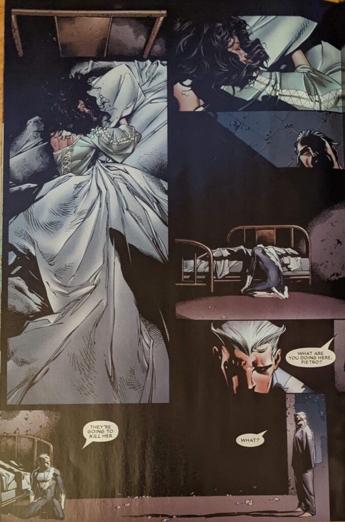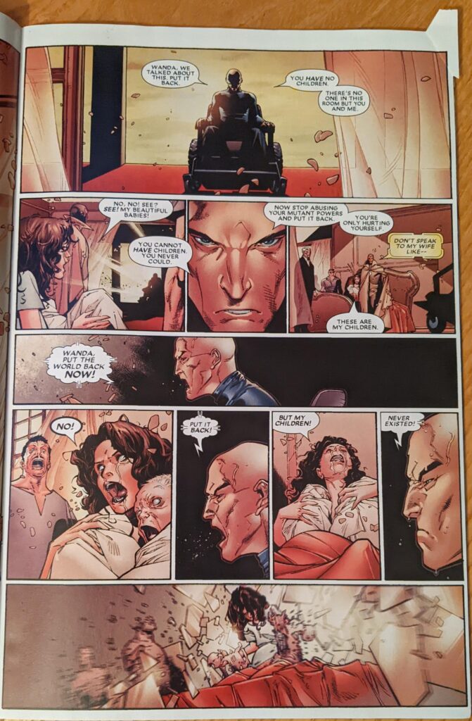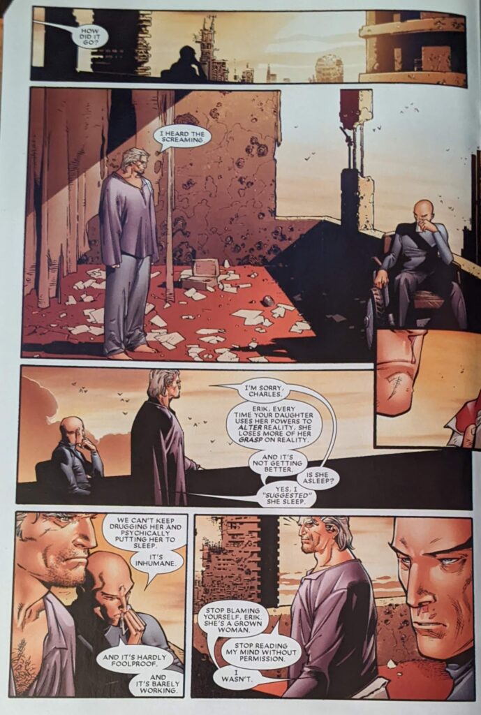 Xavier and Magneto are currently in Genosha, I think, a late 80s island stand in for Apartheid South Africa with mutants as the oppressed people and humans as the oppressors. Genosha was eventually freed, once ruled by Magneto, and then I think turned into a wasteland. Xavier and Magneto were kinda hiding out there after Magneto was killed at the end of Grant Morrison’s X-Men and then immediately got better. I don’t know, I didn’t read the stuff after Morrison. So they’ve brought Wanda here to try to help her.