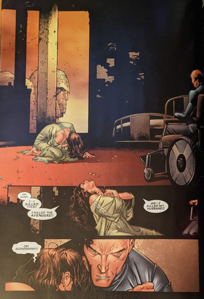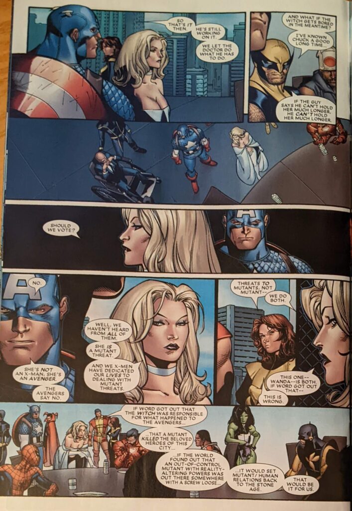 Grim times in a grim place. Meanwhile, in New York (I mean, I guess it seems to be daytime in both places even though they’re a world apart), Carol Danvers, Wonder Man and Falcon are all approaching Avengers tower in regular clothes. They let us know the Avengers have summoned old members to their new digs, and that they’re trying to keep their new base a secret as long as possible, so they couldn’t just fly in. And then… the X-Men just fly in in their scifi plane and land on the roof. Whoops. As in the Sentry story, the X-Men for the purposes of this one are the Astonishing team of Cyclops, Emma Frost, Beast, Kitty Pryde, Wolverine and Colossus, recently revealed to be less dead than advertised after succumbing to the so-called Legacy Virus in the 90s (It was mutant AIDS. Sometimes the metaphors are not subtle!). Hank is very impressed by the new Quinjet model as they land. Inside, they find the Avengers, the previously seen former Avengers, Yellowjacket, Wasp, Dr. Strange, She-Hulk and Professor X, who the X-Men have recently had a serious falling out with, which is why he’s holed up in Genosha with Magnus/Erik/Max. But this is bigger than that, as Xavier says they’re all here to decide the fate of Wanda Maximoff. Back in Genosha…