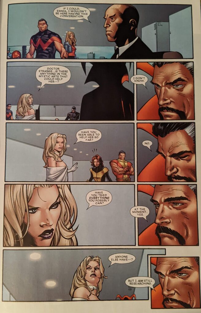 Now, not wanting to kill someone is pretty normal for most superheroes, but Bendis has a weird plan for Wonder Man, and this reads a certain way in retrospect. So, the whole gang flies to the burnt out husk of Genosha, and when they arrive, Wanda, Pietro and Magneto are all gone. And as everyone reacts, Professor X disappears, too. Emma gets a fix on Wanda.