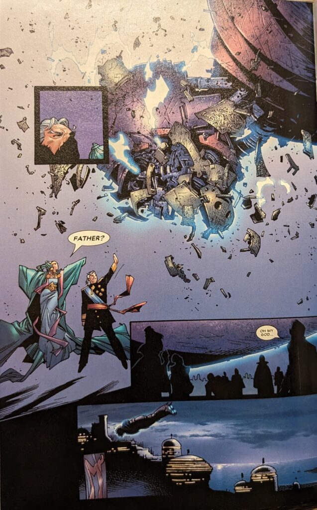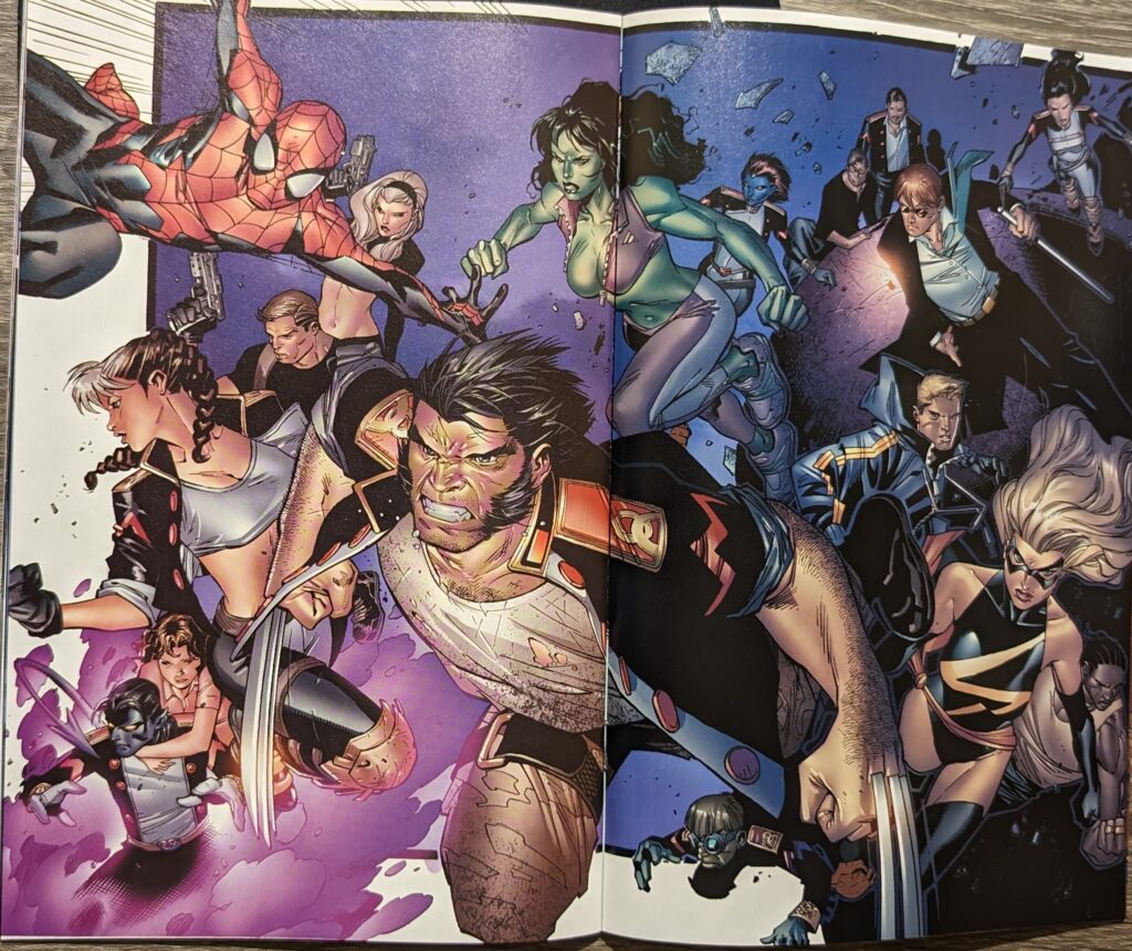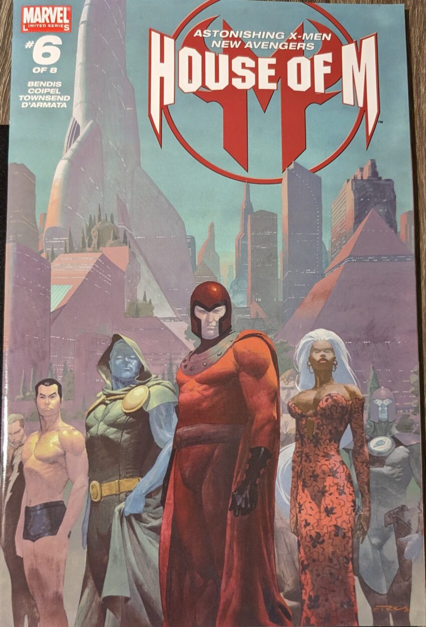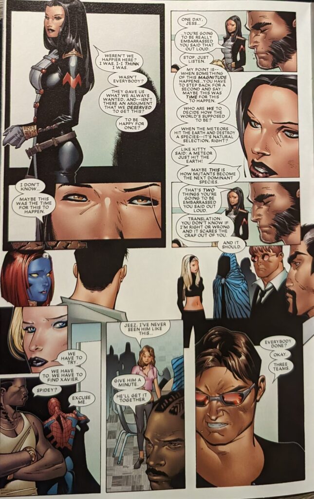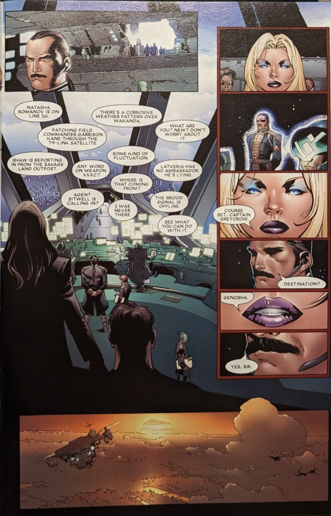 I think I’ve mentioned before that in the book All of the Marvels, author Douglas Wolk astutely identified the archetypal Brian Michael Bendis plot as “the status quo has changed, how does everyone react?” House of M is really fertile ground for that. As the big guests of the evening are announced on a red carpet in Genosha, first T’Challa, then Doom, then Genis-Vell of the Kree Empire (Marv-ell’s son in either timeline), then Princess Ororo of Kenya, which is a big revelation, then King Namor of Atlantis. Scott explains Emma, Layla and Cloak’s job is to find and “wake up” Xavier, if he even exists. He warns that no matter how protected they are, the Genoshans are going to notice something is up. Team 2 is just Dr. Strange trying to reach and reason with Wanda. And team 3 is everyone else causing a distraction. As the house of Magnus is presented to the crowd, one of their soldiers notices something is up, and one of their sentinels comes falling out of the sky.