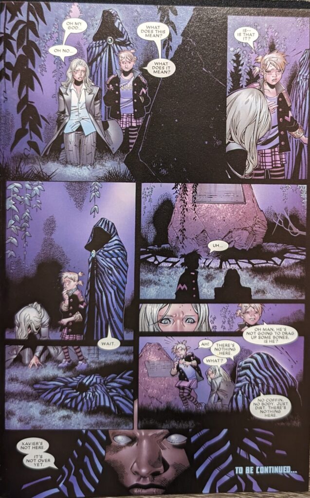 She-Hulk’s boob there is so ridiculous. That aside, or maybe included, the original art for this splash must have gone for a zillion dollars. Battle is joined with maximum destruction, and Pietro notices his dad has disappeared. While that’s going on, Emma’s team discovers Xavier’s memorial.