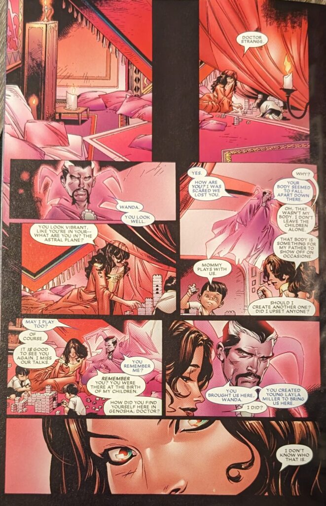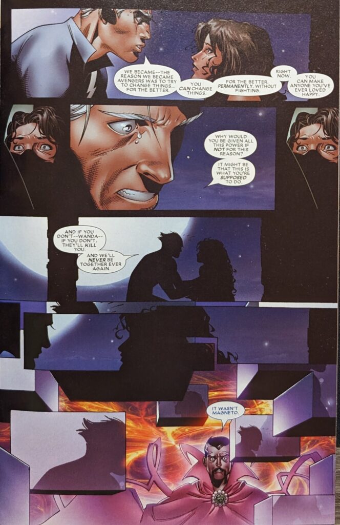 There it is, the big twist. Everyone just assumed evil ol’ Magneto remade the world in his image, but it was done TO him, and he seems to sense it, too, based on little hints throughout the series. Strange telepathically asks Emma if she’s hearing all this, and she says to ask where Xavier is, but then, Wanda is shot by a single arrow. And at the same time, Magneto finds Emma & Layla, but before he can attack, they put the whammy on him.