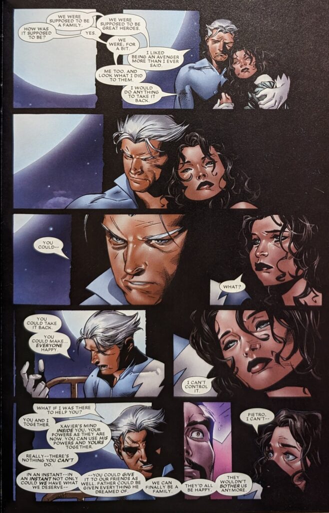We rewind to the moment Pietro confronted Magneto in issue 1, spending frankly too much time recreating that scene almost in its entirety, then moving past it to Wanda saying, from her bed, that Magneto doesn’t respond well to yelling. She says “her friends” are coming and it will all be over soon, over Pietro’s many protestations, and asks if she’s a coward for not killing herself even though she knows she should. She’s not even sure any of this is real. Dark. Pietro says the 2 of them never had a chance.