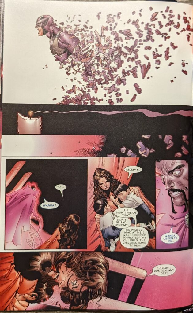 So if you died in an explosion in the real world created by Wanda’s hex, and then she reshapes the entire world and brings you back, and then she kills you in that world, also… are you dead? Down on the field, a deranged Pietro is zipping around almost fighting everyone himself, until a very cross, newly enlightened Magneto appears.