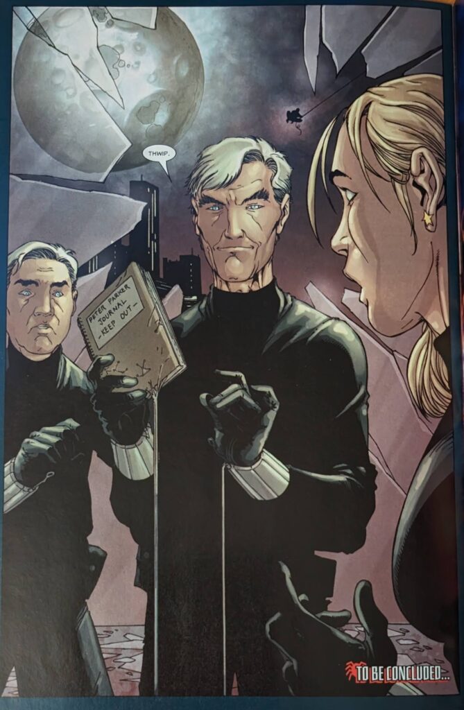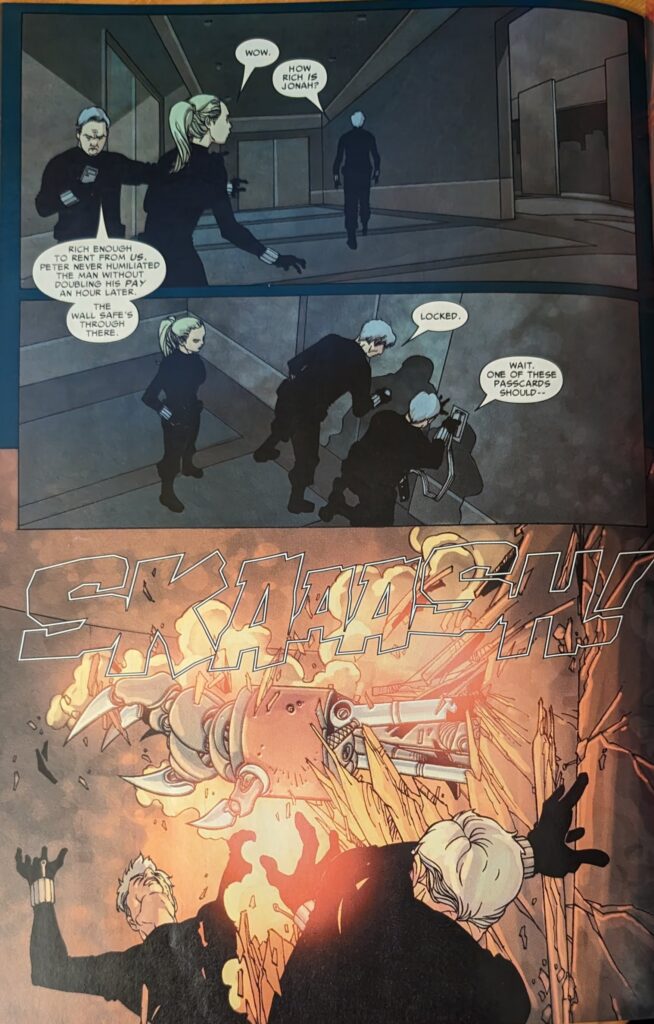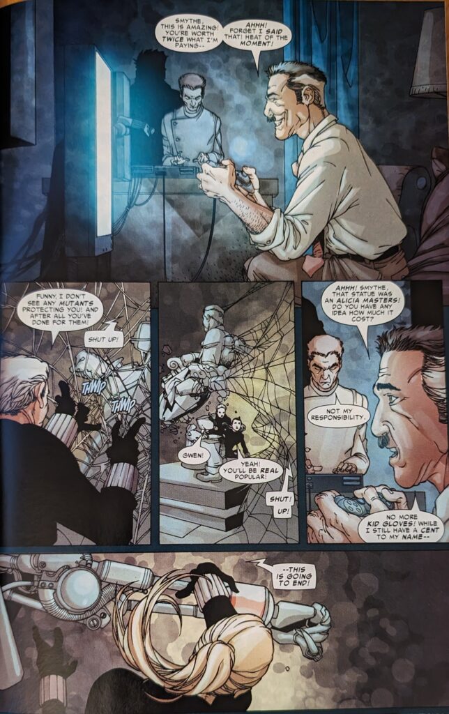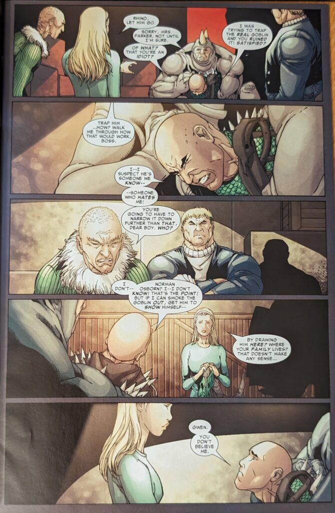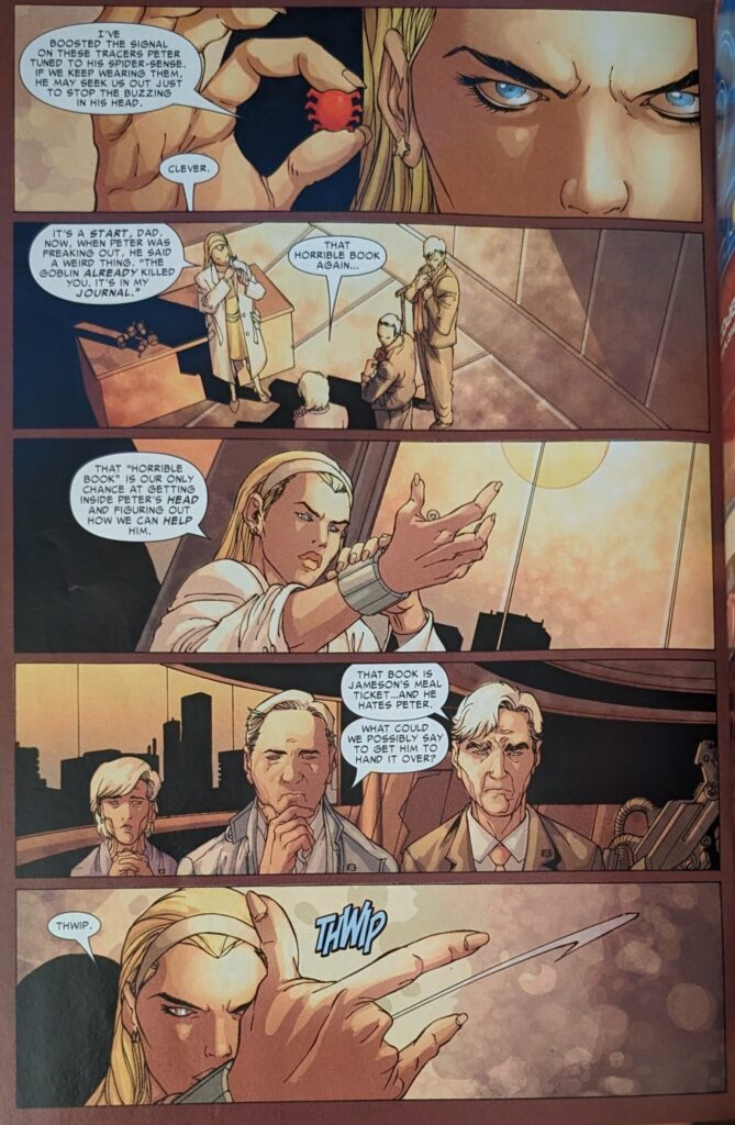 Ok! We go off to see JJJ and Norman Osborn having dinner, Osborn acting very impressed by how insane Peter outing himself through Jonah sounds. JJJ is begging him for protection, but Norman reiterates that Parker has all his stuff. But JJJ somehow knows Norman does some black market training, so Norman gives him an address for “a man named Smythe who builds machines.” Sure, why not? Now Gwen, George & Ben are breaking into… somewhere… Gwen urging them to turn back, the men refusing.