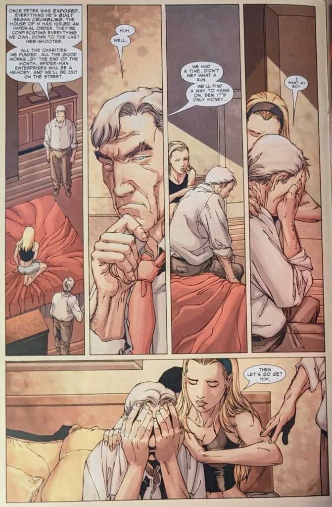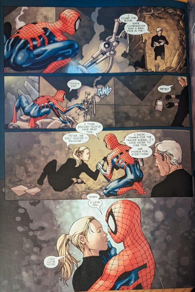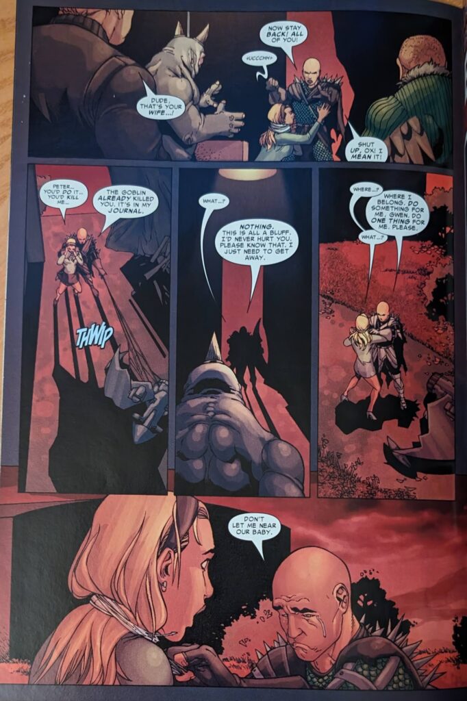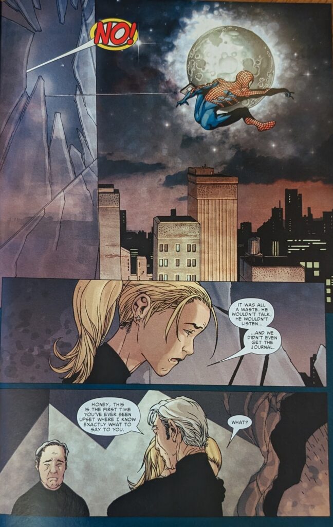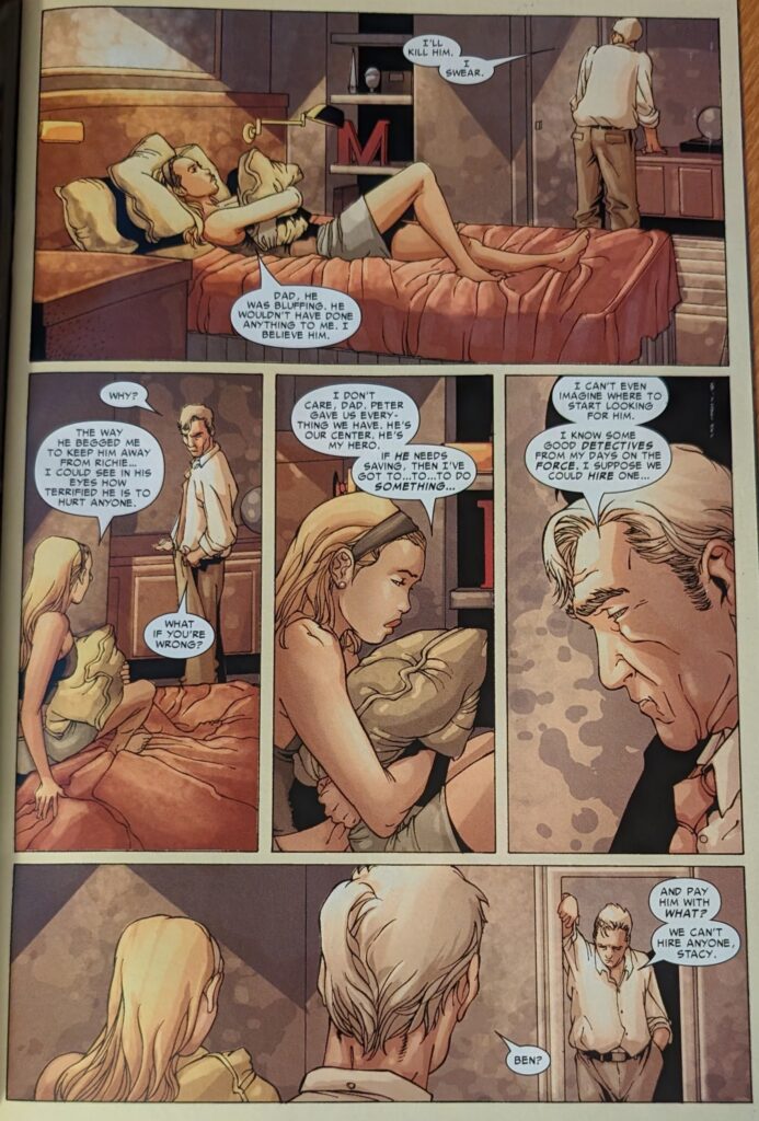 Ok! We go off to see JJJ and Norman Osborn having dinner, Osborn acting very impressed by how insane Peter outing himself through Jonah sounds. JJJ is begging him for protection, but Norman reiterates that Parker has all his stuff. But JJJ somehow knows Norman does some black market training, so Norman gives him an address for “a man named Smythe who builds machines.” Sure, why not? Now Gwen, George & Ben are breaking into… somewhere… Gwen urging them to turn back, the men refusing.