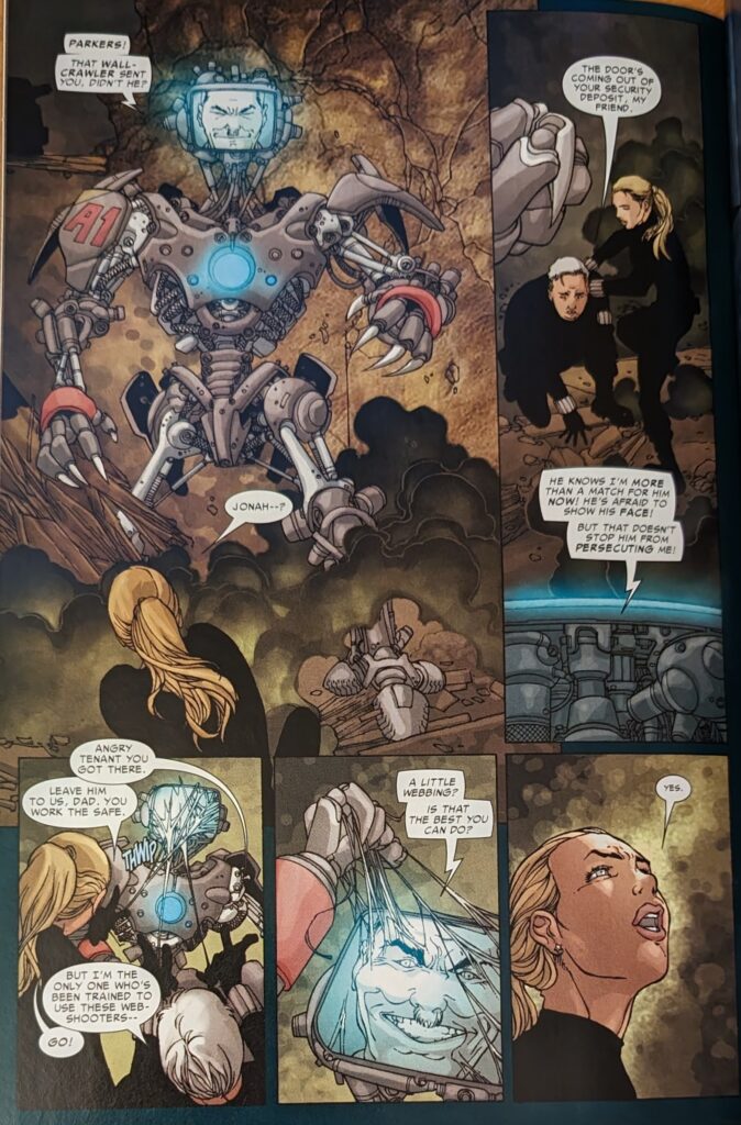 Just when I’m thinking JJJ is gonna kill Gwen in this world, ‘cuz seems like someone will, Spider-Man smashes in and demolishes the Spider-Slayer pretty easily.