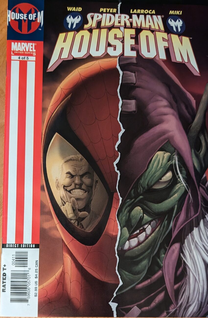 What? Is this him after he learned the world is a lie trying to blow up his own life? What even is this? Well, Peter flees on his totally functional Goblin Glider which, A, how does he have that, and B, he blew it up last issue, only to be attacked by a Sentinel. You wouldn’t think a giant flying robot could sneak up on someone, but that’s comics, I guess. Retreating from chasing Peter, Vulture says “they’ve been dusting off every human control law on the books” since Peter was outed (wut), and he won’t get caught flying while human. Meanwhile, on TV, JJJ is not even worried to be told people are calling him a race traitor, because the Goblin helped him get that weasel, Parker, and then they get interrupted by footage seemingly proving Peter is the Green Goblin via the Sentinel’s eye camera. We see some cops on the street arresting a guy for pretending to be a mutant, telling each other to stay vigilant, because if Spider-Man “can turn out to be human, anyone can.”