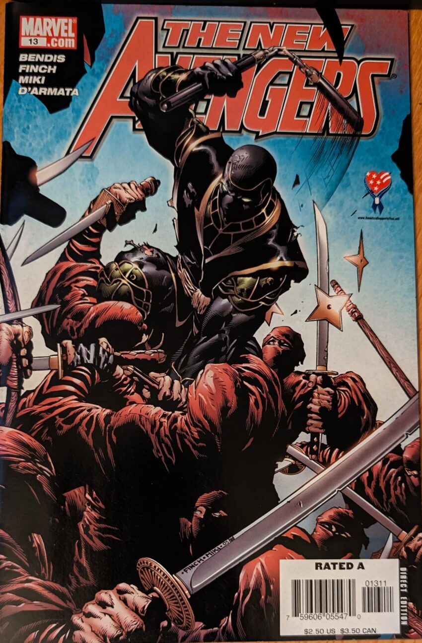 Gasp! Cap isn’t totally dumb! Will Jessica come clean? What happens if she does? That’ll all have to wait til the block after next. In what this experience cemented as typical Bendis fashion, a year after insisting no one had figured out who the villain of Disassembled was despite everyone figuring out who the villain of Disassembled was, Bendis insisted at the time that this was always the plan, that Ronin was always Echo, despite that making no sense whatsoever. Despite the fact that it was perfectly teed up to be Daredevil to the point that literally anyone else wouldn’t make sense. It was only years later that he admitted the truth of the behind-the-scenes DD changes. Part of the problem was his DD story wasn’t over yet when this saw print, but his final issue was only 4 months away, the secrecy wasn’t gonna last much longer. And it still took a long time after the fact for him to admit what happened. Just a weird series of events. And a pretty unsatisfying unmasking. Even sillier, we’ll never see Echo in the Ronin suit again. But anyone who’s seen the Marvel movies can probably guess who its next occupant is. And I don’t know if it was meant to be, but that’s Dave Finch’s final issue of New Avengers. Seems a rather abrupt exit. His next regular gig a revamped Moon Knight series, of all things. But I think it was the age-old strategy of putting a very popular creator on a not-so-popular book to juice sales. Anyway. New Avengers will not have anything like a regular artist for a whopping 14 issues after this. Which was somewhat by design, but even so, what quickly became Marvel’s biggest title not having a regular artist was and is pretty insane.