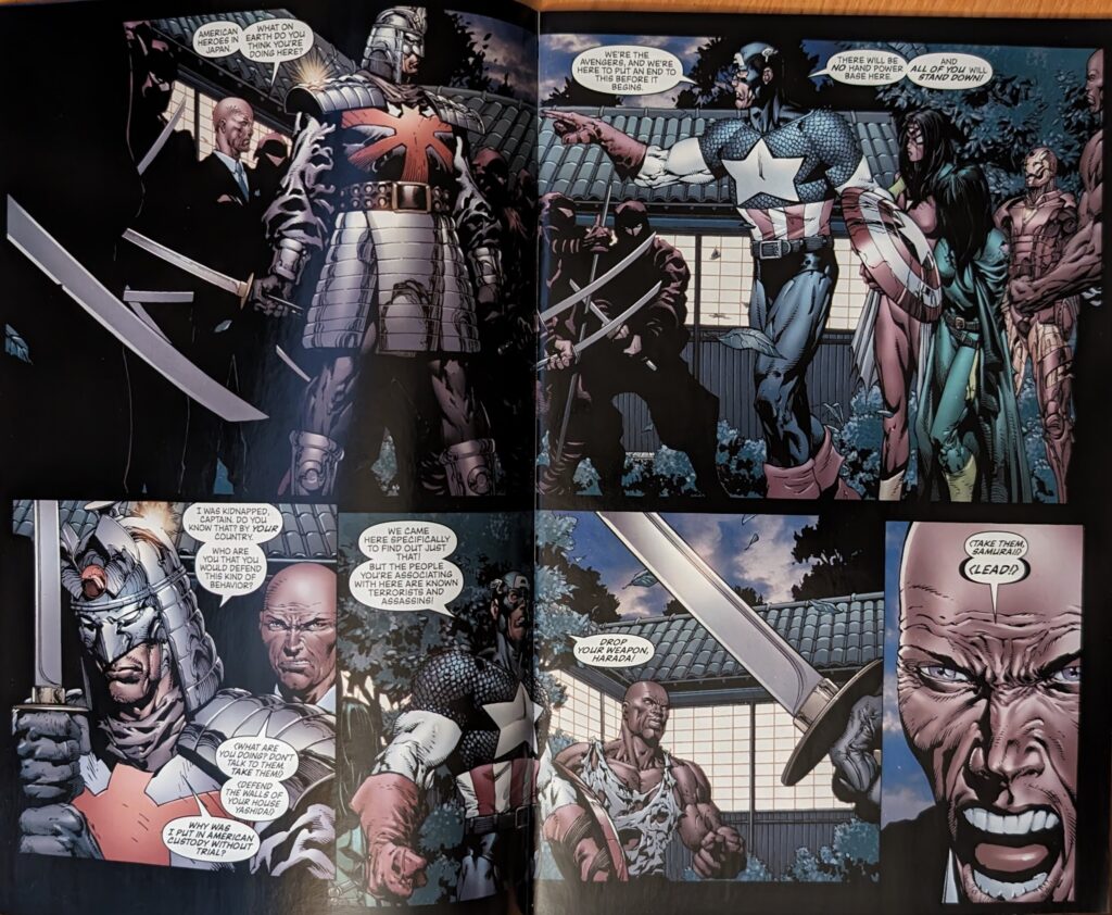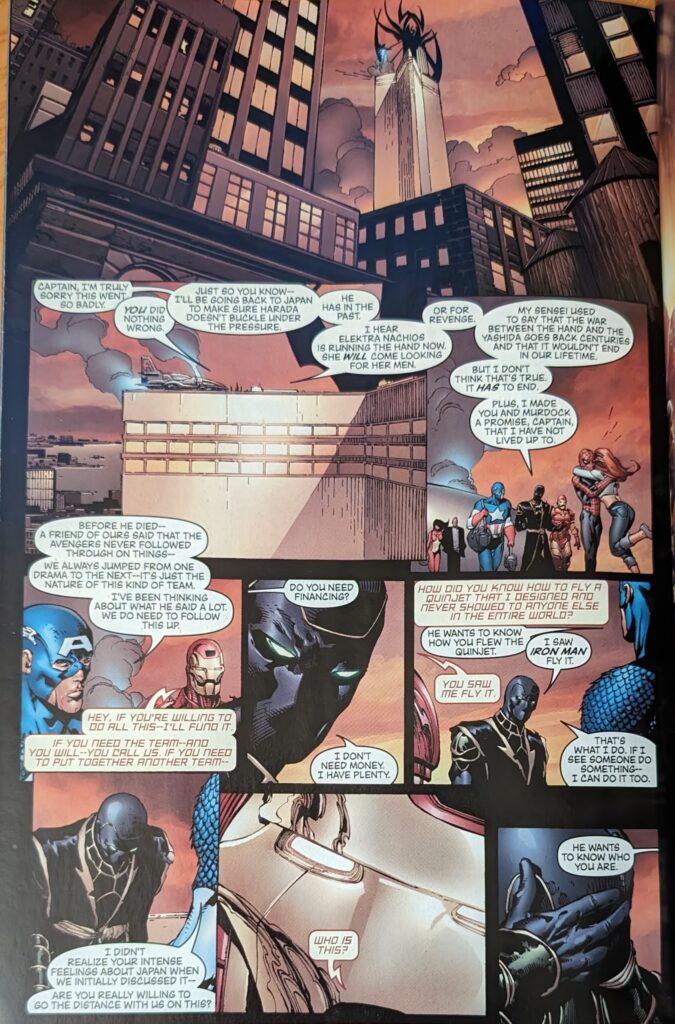 This isn’t really lining up with what I know of Silver Samurai (“Hi, Jessica?”), but what I know isn’t a whole lot. He sure did used to be pals with Viper, tho. He even points that out as Jessica insists they’re taking Viper into custody. But he says he’s going to take credit for the fall of the Hand and use that to rebuild his name, and the Avengers leave. As they fly, Spider-Man notes that, if the Sentry had been with them, it would’ve been over in minutes, but Cap says Sentry isn’t ready yet. Jess says Harada is already talking to the press, and Tony says they should do the same. That it’s time to announce the new Avengers to the world. Cap is taking the implication that the US government is responsible for Harada and others being kidnapped hard, and Tony wonders why. Meanwhile, in the back of the jet, Spider-Man is desperate to know who Ronin is, but all his guesses go nowhere, and Ronin and Cap are keeping it a secret… for some reason? Then, in a sequence that ought to be claustrophobic and tense, but is frankly beyond David Finch’s skills in this period, Viper wordlessly communicates to Jess that now’s the time for her to escape, and Jessica unhappily, stealthily opens an emergency hatch.