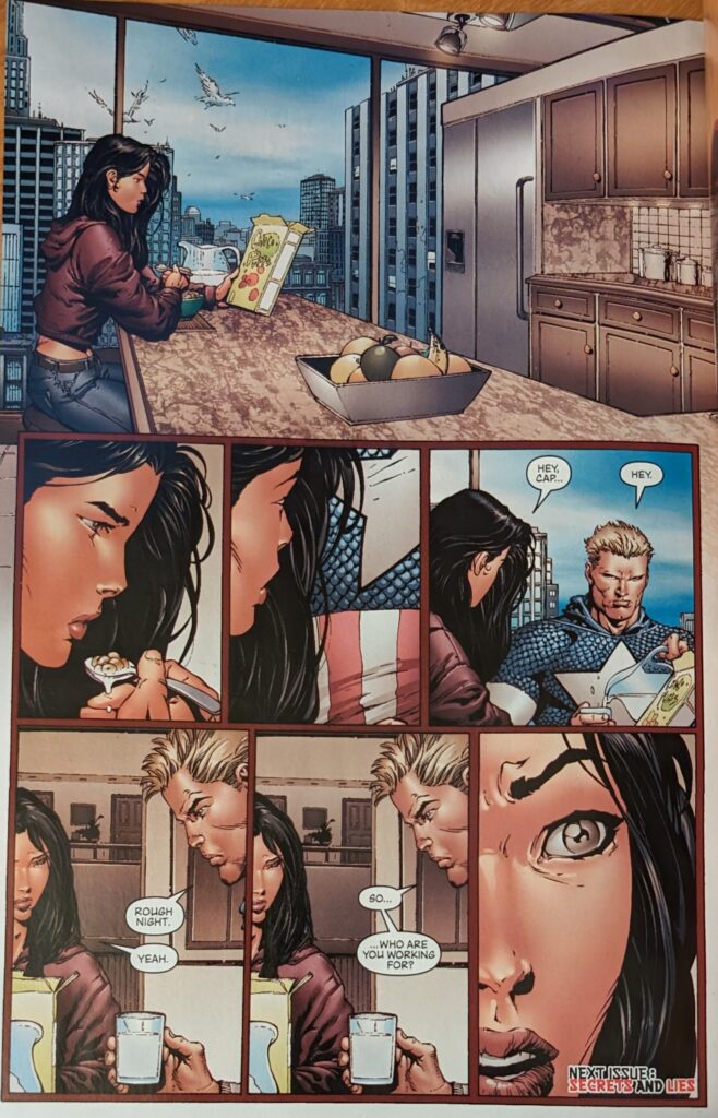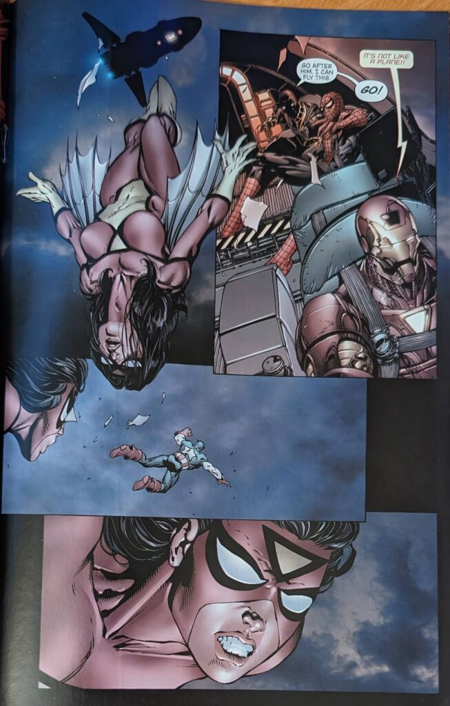 Jess grabs Cap with her legs, but isn’t strong enough to carry both of them, and then Iron Man grabs her, noting it was a close one. Back in the plane, there’s a brief argument about whether she could’ve survived her escape, and how it could’ve happened, and Ronin seems to know, but doesn’t say anything.
