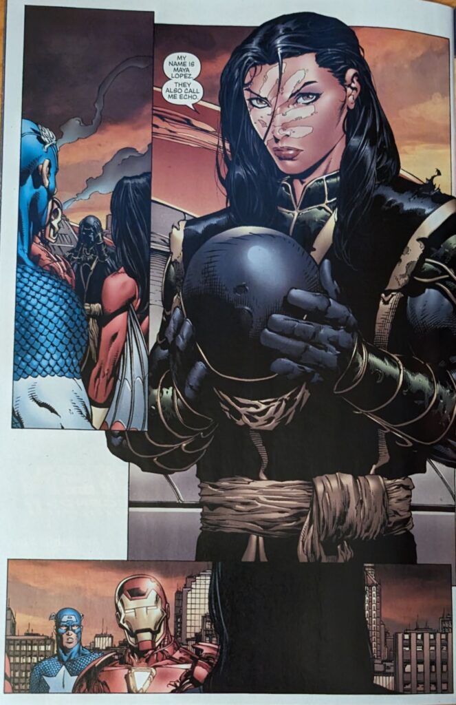 Because “he” wouldn’t have known what Iron Man was saying the whole time due to being deaf! Womp womp! There is literally no reason Echo needed to wear a fake man suit. None! One more page, tho: